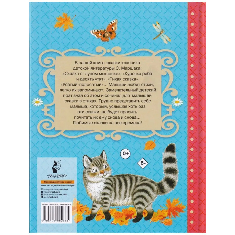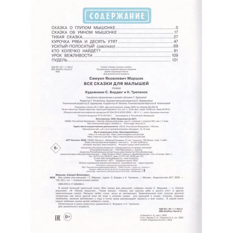 Все сказки для малышей. ISBN 9785-17088-2885. Все сказки для малышей. Маршак. С. В этой большой красочной книге "Все сказки для малышей" собраны сказки С. Маршака - о глупом мышонке, об умном мышонке (поумневшем глупом мышонке), "Тихая сказка", "Сказка про курочку Рябу и десять утят" и другие замечательные сказки. Малыши любят стихи, легко их запоминают. Замечательный поэт, классик детской литературы как никто другой знал об этом и сочинял сказки для малышей в стихах. Строчки, ставшие любимыми, малыши запоминают с ходу и почти сразу рассказывают наизусть и всю сказку... В нашей книге самые любимые сказки детей любимого поэта. Иллюстрации в книге известных художников С. Бордюга и Н. Трепенок.