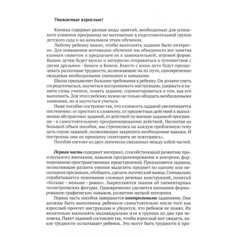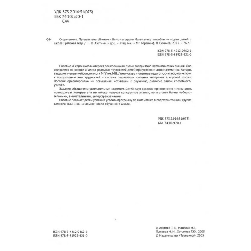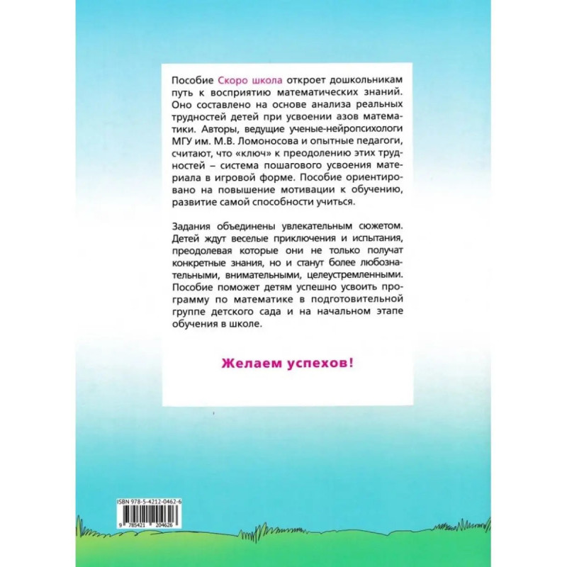 Скоро школа. Путешествие с Бимом и Бомом в страну математику. Пособие по подготовке детей к школе. 6-е издание. Ахутина Т. В., Манелис Н. Г., Пылаева Н. М., Хотылева Т. Ю.Пособие "Скоро школа" откроет дошкольникам путь к восприятию математических знаний. Оно составлено на основе анализа реальных трудностей детей при усвоении азов математики. Авторы - ведущие ученые-нейропсихологии МГУ им. М. В. Ломоносова и опытные педагоги - считают, что "ключ" к преодолению этих трудностей - система пошагового усвоения материала в игровой форме. Пособие ориентировано на повышение мотивации к обучению, развитие самой способности учиться. Задания объединены увлекательным сюжетом. Детей ждут веселые приключения и испытания, преодолевая которые, они не только получат конкретные знания, но и станут более любознательными, внимательными целеустремленными. Пособие поможет детям успешно усвоить программу по математике в подготовительной группе детского сада и на начальном этапе обучения в школе. К рабочей тетради прилагается методическое пособие.В комплект входит: 1 рабочая тетрадь и 1 методическое пособие для подготовки детей к школе.