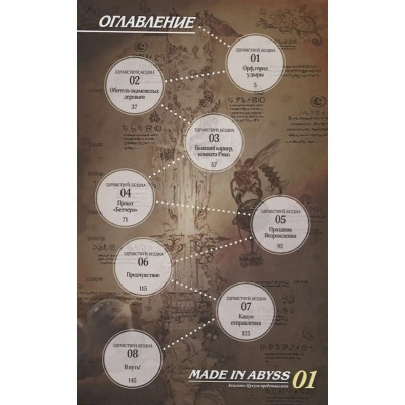 Made in Abyss. Созданный в Бездне. Том 1. На земле осталось только одно неизведанное место таинственная пропасть, которую прозвали Бездной. В Бездне не действуют законы физики, и никто не знает, насколько она глубока. В небольшом городке Орф на самом краю Бездны живёт Рико дочь знаменитой исследовательницы глубин Лайзы по прозвищу "Уничтожительница", пропавшей десять лет назад. Рико хочет стать исследователем, как её мама, и заниматься поиском таинственных древних артефактов. И однажды она находит странного робота, очень похожего на обычного мальчика.
