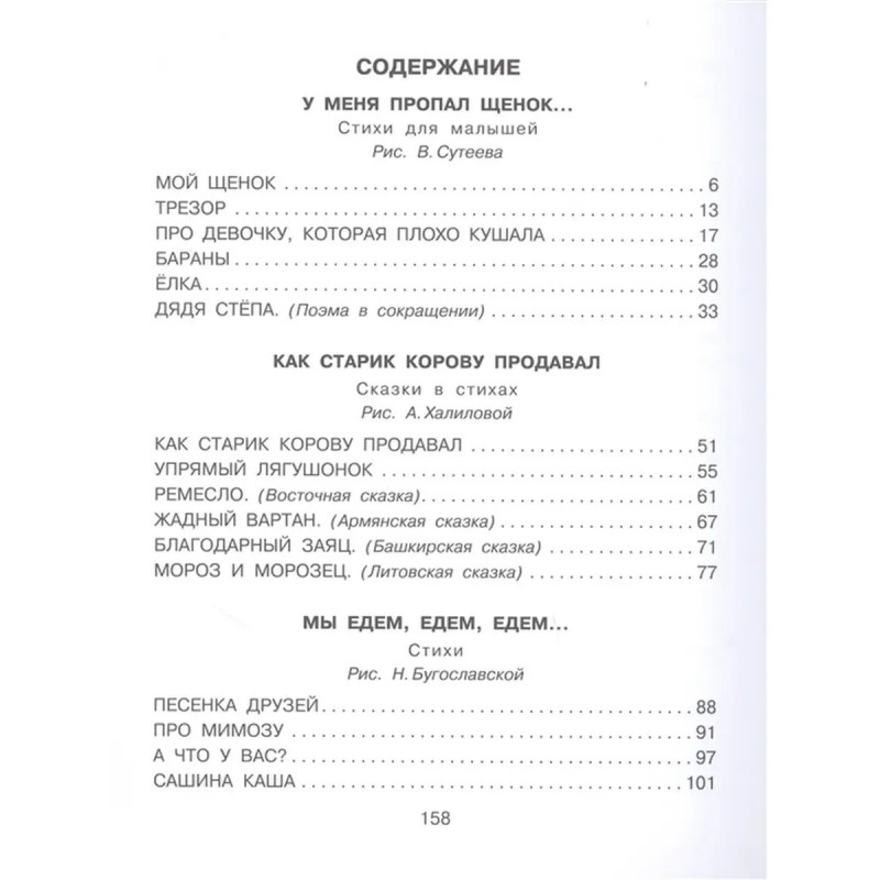 Стихи и сказки для самых маленьких. В книгу С. Михалкова Стихи и сказки для самых маленьких вошли лучшие произведения автора для детей: стихи А что у вас?, Трезор, Песенка друзей, Где очки?, Анна-Ванна бригадир, сказки в стихах Как старик корову продавал, Упрямый Лягушонок, Ремесло, знаменитая поэма Дядя Стёпа. В своих произведениях С. Михалков просто и понятно рассказывает малышам о самом главном о дружбе, уважении, взаимопомощи, трудолюбии, и по-доброму смеётся над ленивыми и нерадивыми. Для детей до 3-х лет.