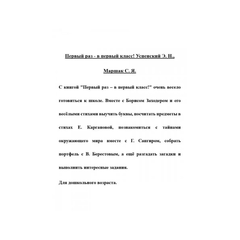 Первый раз - в первый класс!. С книгой "Первый раз в первый класс!" очень весело готовиться к школе. Вместе с Борисом Заходером и его весёлыми стихами выучить буквы, посчитать предметы в стихах Е. Каргановой, познакомиться с тайнами окружающего мира вместе с Г. Сапгиром, собрать портфель с В. Берестовым, а ещё разгадать загадки и выполнить интересные задания. Для дошкольного возраста.