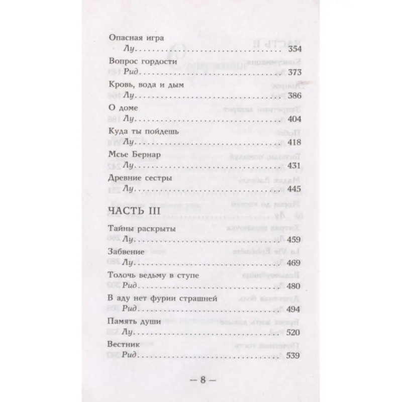 ISBN 9785-17121-1417. Змей и голубка. Два года назад ведьма Луиза ле Блан покинула свой ковен, нашла приют в городе Цезарин и теперь живет лишь воровством. Ей пришлось отказаться от колдовства, ведь в Цезарине на ведьм идет охота. Их боятся. Их предают огню. Рид Диггори охотник на ведьм и преданный служитель Церкви. Их с Луизой пути никогда не должны были сойтись, и все же коварная уловка сводит их вместе в невозможный союз. Война между ведьмами и Церковью стара как мир, и опаснейшие враги грозят Лу судьбой куда страшнее огня. Но она не в силах противиться чувствам, которые зарождаются в душе, но так же не в силах изменить свою сущность. Лу должна сделать выбор.