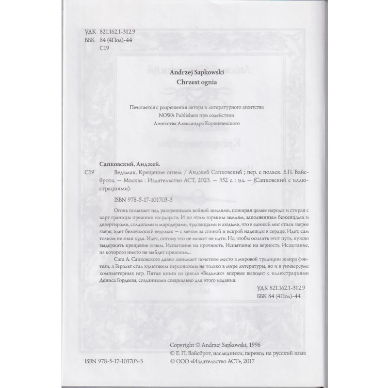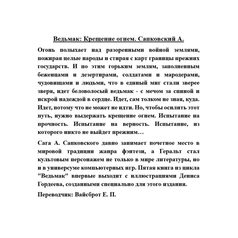 Ведьмак: Крещение огнем. Огонь полыхает над разоренными войной землями, пожирая целые народы и стирая с карт границы прежних государств. И по этим горьким землям, заполненным беженцами и дезертирами, солдатами и мародерами, чудовищами и людьми, что в единый миг стали зверее зверя, идет беловолосый ведьмак с мечом за спиной и искрой надеждой в сердце. Идет, сам толком не зная, куда. Идет, потому что не может не идти. Но, чтобы осилить этот путь, нужно выдержать крещение огнем. Испытание на прочность. Испытание на верность. Испытание, из которого никто не выйдет прежним Сага А. Сапковского давно занимает почетное место в мировой традиции жанра фэнтези, а Геральт стал культовым персонажем не только в мире литературы, но и в универсуме компьютерных игр. Пятая книга из цикла "Ведьмак" впервые выходит с иллюстрациями Дениса Гордеева, созданными специально для этого издания.