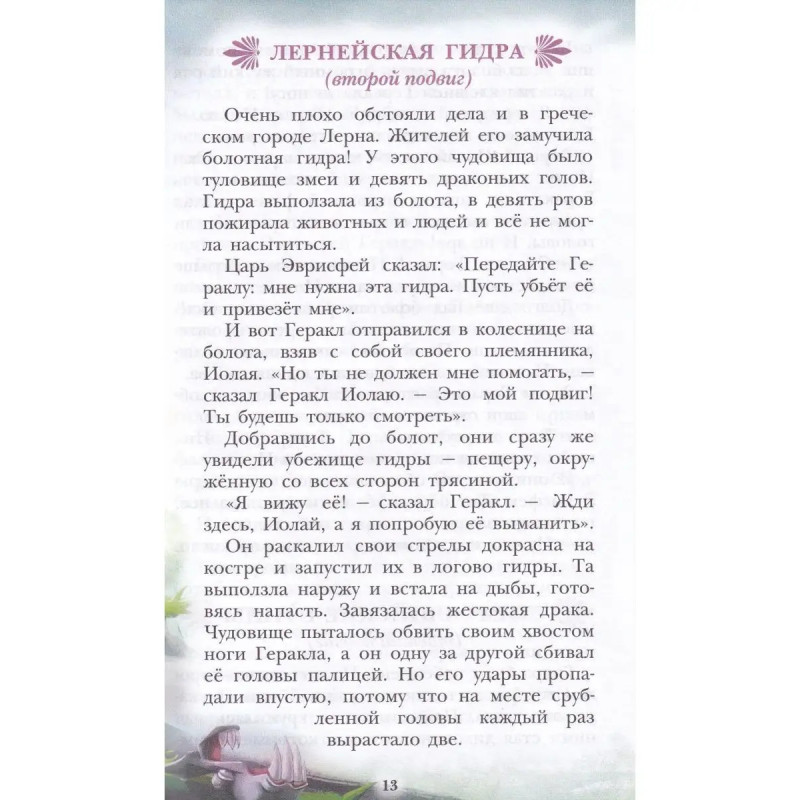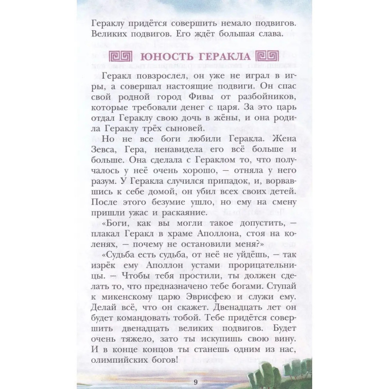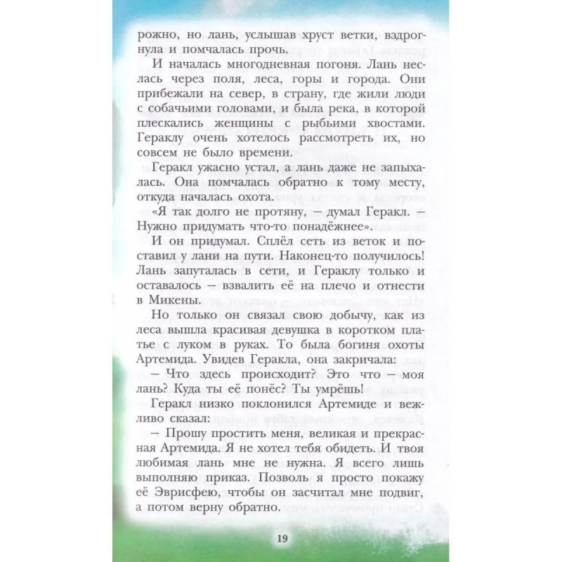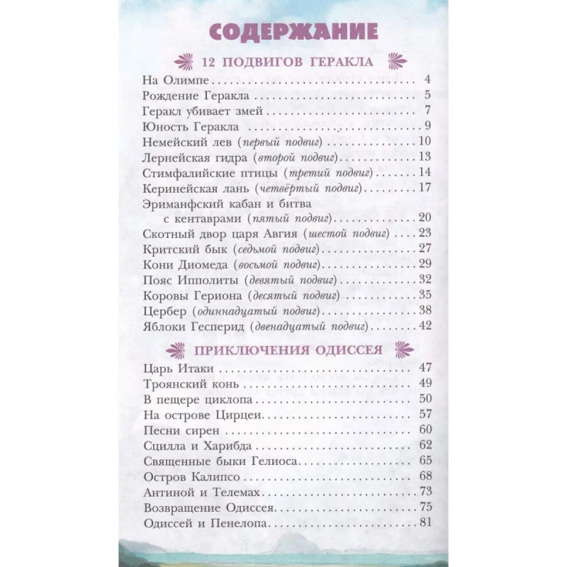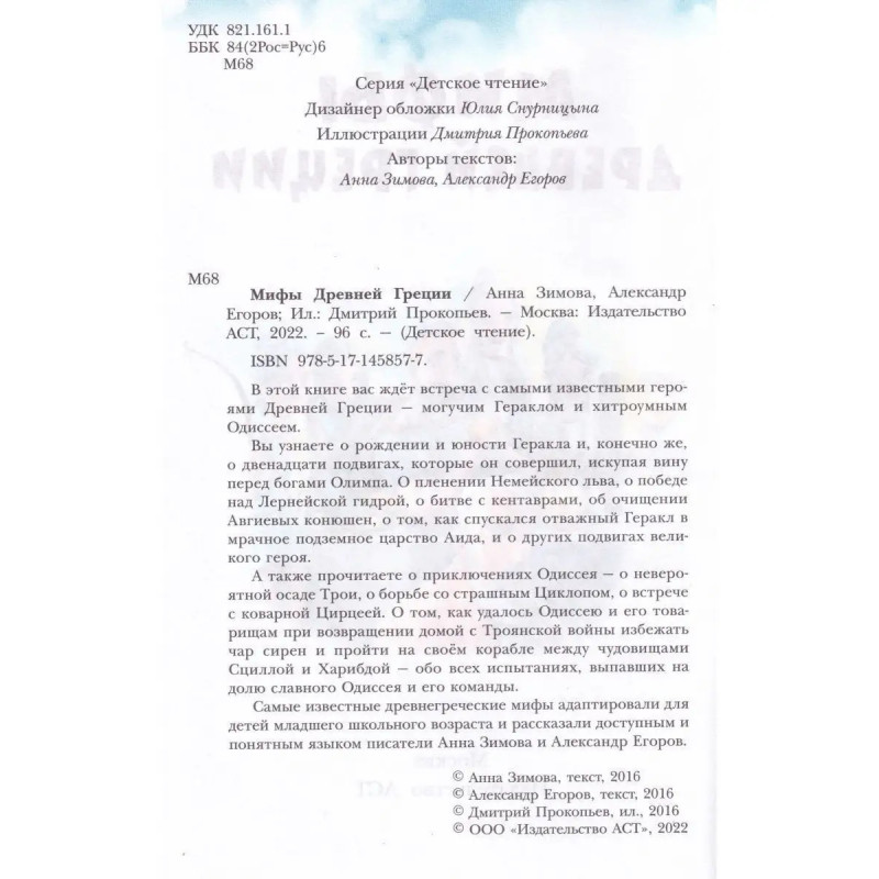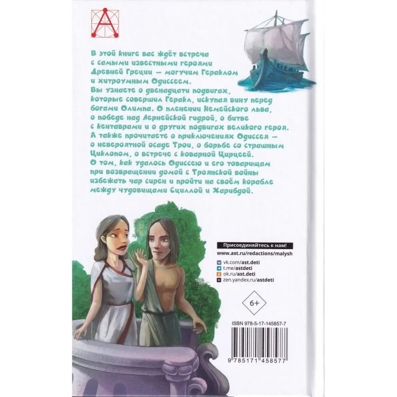 Мифы Древней Греции. ISBN 9785-17145-8577. В этой книге вас ждёт встреча с самыми известными героями Древней Греции могучим Гераклом и хитроумным Одиссеем. Вы узнаете о рождении и юности Геракла и, конечно же, о двенадцати подвигах, которые он совершил, искупая вину перед богами Олимпа. О пленении Немейского льва, о победе над Лернейской гидрой, о битве с кентаврами, об очищении Авгиевых конюшен, о том, как спускался отважный Геракл в мрачное подземное царство Аида, и о других подвигах великого героя. А также прочитаете о приключениях Одиссея о невероятной осаде Трои, о борьбе со страшным Циклопом, о встрече с коварной Цирцеей. О том, как удалось Одиссею и его товарищам при возвращении домой с Троянской войны избежать чар сирен и пройти на своём корабле между чудовищами Сциллой и Харибдой обо всех испытаниях, выпавших на долю славного Одиссея и его команды.