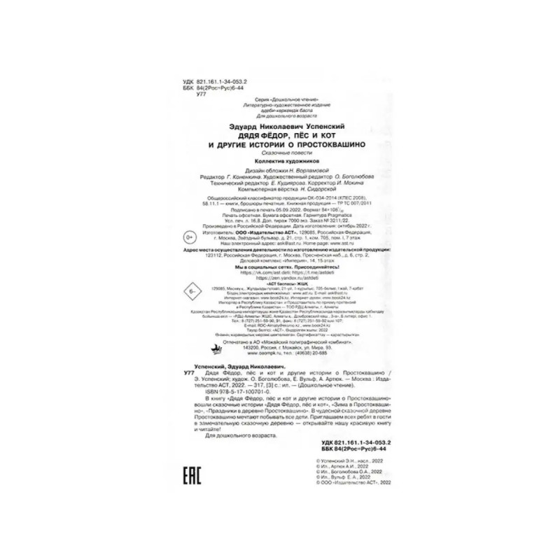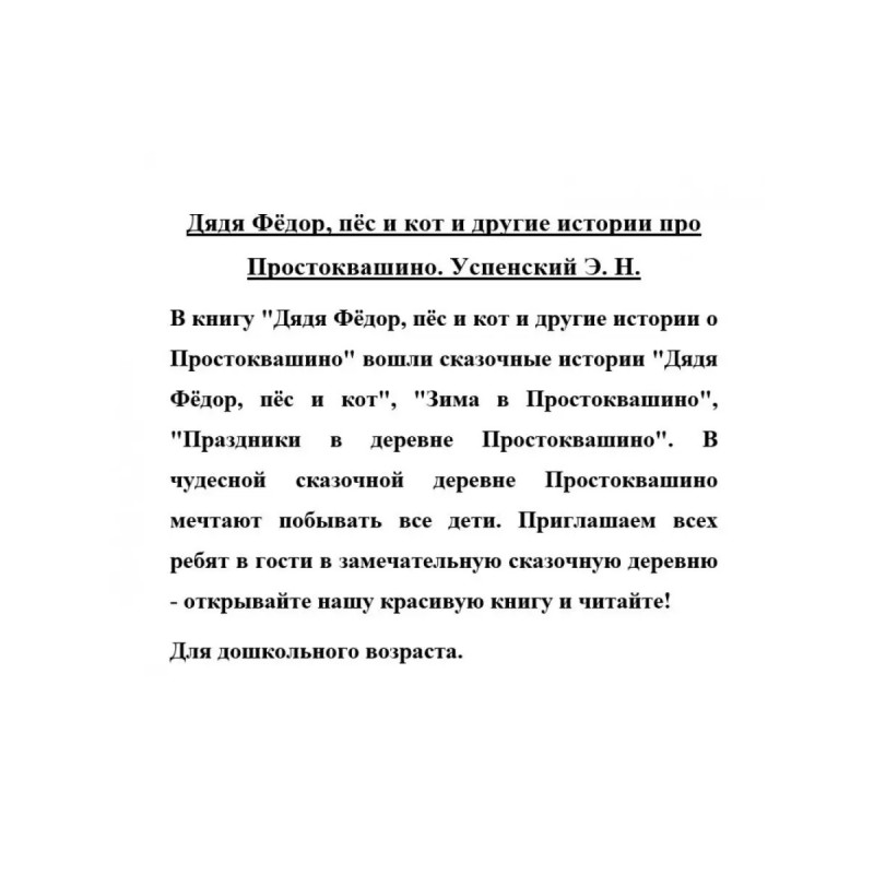 Дядя Фёдор, пёс и кот и другие истории про Простоквашино. В книгу "Дядя Фёдор, пёс и кот и другие истории о Простоквашино" вошли сказочные истории "Дядя Фёдор, пёс и кот", "Зима в Простоквашино", "Праздники в деревне Простоквашино". В чудесной сказочной деревне Простоквашино мечтают побывать все дети. Приглашаем всех ребят в гости в замечательную сказочную деревню - открывайте нашу красивую книгу и читайте!Для дошкольного возраста.