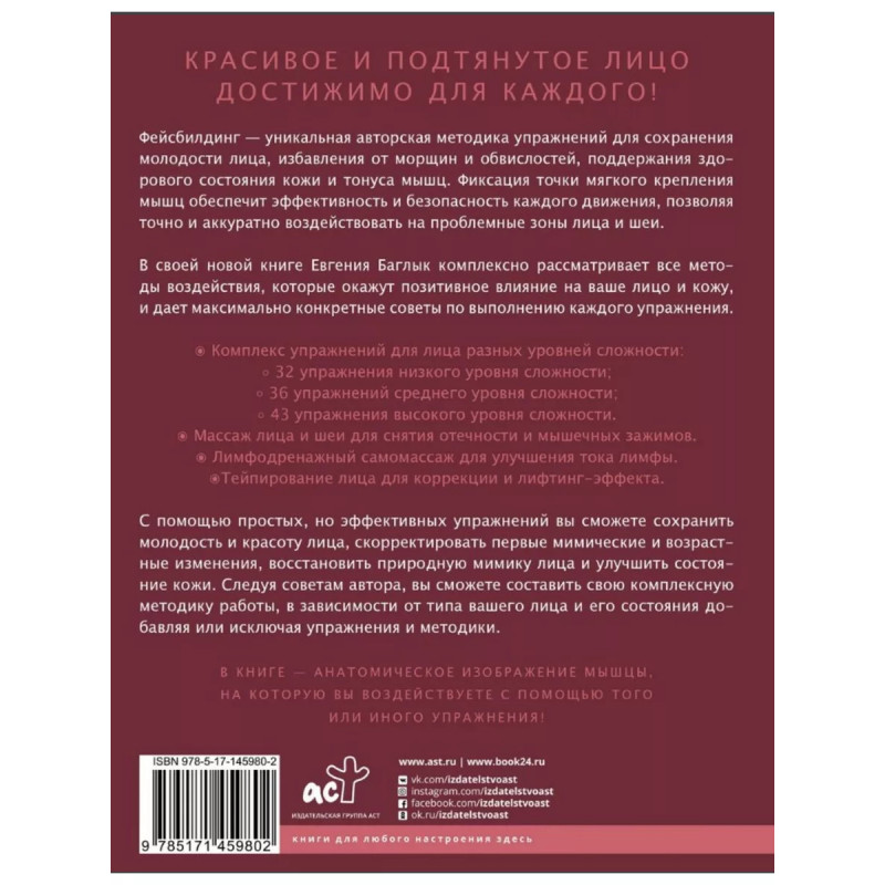 Правильный фейсбилдинг и тейпирование. Неинвазивные методы сохранения молодости лица. Баглык Е. А. Красивое и подтянутое лицо достижимо для каждого!Фейсбилдинг - уникальная авторская методика упражнений для сохранения молодости лица, избавления от морщин и обвислостей, поддержания здорового состояния кожи и тонуса мышц. Фиксация точки мягкого крепления мышц обеспечит эффективность и безопасность каждого движения, позволяя точно и аккуратно воздействовать на проблемные зоны лица и шеи. В своей новой книге Евгения Баглык комплексно рассматривает все методы воздействия, которые окажут позитивное влияние на ваше лицо и кожу, и дает максимально конкретные советы по выполнению каждого упражнения.- Комплекс упражнений для лица разных уровней сложности:32 упражнения низкого уровня сложности.