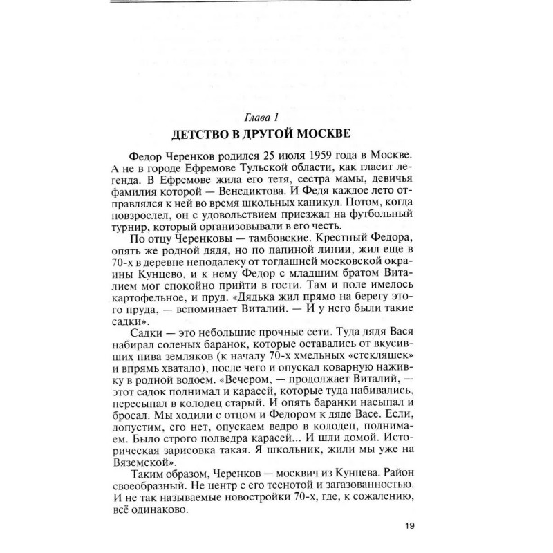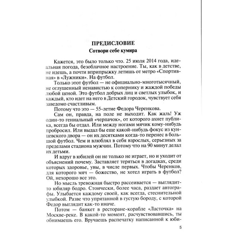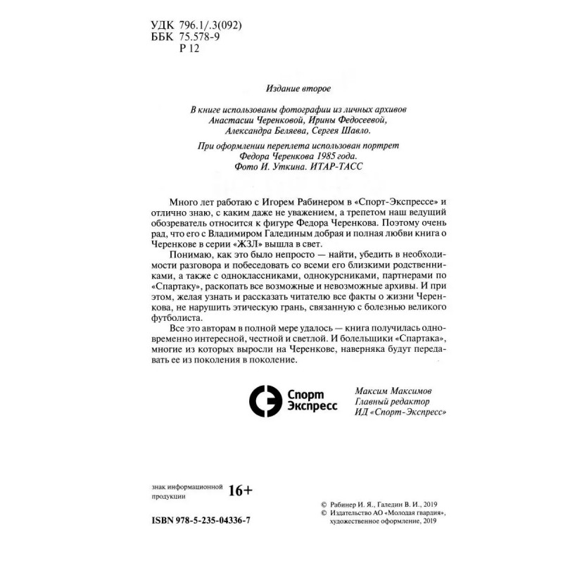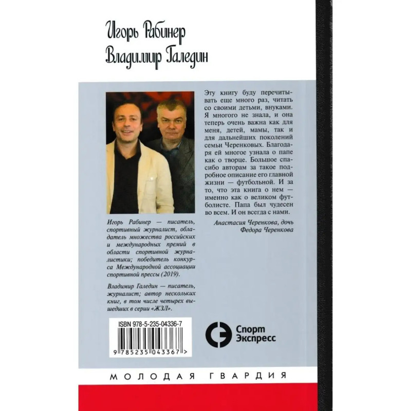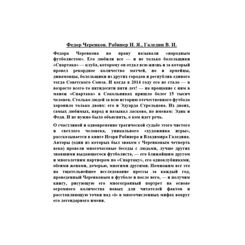Федор Черенков. Рабинер И. Я., Галедин В. И. Федора Черенкова по праву называли народным футболистом. Его любили все - и не только болельщики Спартака клуба, которому он отдал всю жизнь и за который провел рекордное количество матчей, но и армейцы, динамовцы, болельщики из других городов и республик единого тогда Советского Союза. И когда в 2014 году его не стало - в возрасте всего-то пятидесяти пяти лет! на прощание с ним в манеж Спартака в Сокольниках пришло более 15 тысяч человек. Столько людей за всю историю отечественного футбола хоронило только двоих: его и Эдуарда Стрельцова. Их двоих, самых любимых, народ и называл ласково, по именам: Эдик и Федя. И не нужно было объяснять, о ком идет речь. О счастливой и одновременно трагической судьбе этого чистого и светлого человека, уникального художника игры, рассказывается в книге Игоря Рабинера и Владимира Галедина. Авторы (один из которых был знаком с Черенковым четверть века) провели многочасовые беседы с людьми, лучше других знавшими выдающегося футболиста, его ближайшим другом и многолетним партнером по Спартаку, его одноклубниками, обеими женами, дочерью, многими другими. Помножим все это на тщательнейшее исследование прессы за каждый год, проведенный Черенковым в футболе и после него, и получим книгу, рисующую его многогранный портрет на основе огромного количества новых для читателей фактов и расставляющую точки над i в многочисленных мифах вокруг его легендарного имени.