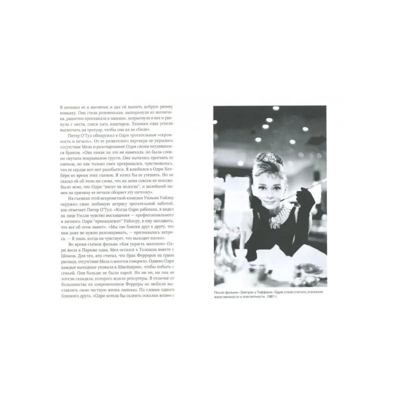 Одри Хепбёрн называют последней принцессой Голливуда. Огромные глаза, точеная фигурка, лучезарная улыбка и природная элегантность обессмертили ее образ. За первую же главную роль, сыгранную в кино, она получила премию "Оскар". Одри сделала головокружительную карьеру, снимаясь вместе с величайшими актерами Грегори Пеком, Хамфри Богартом, Генри Фондой, Фредом Астером, Гари Купером, Кэри Грантом, Шоном Коннери. Множество женщин подражали ее стилю, копируя прическу, нося шарфики и костюмы, похожие на те, что делал для нее Юбер де Живанши. В 38 лет она навсегда попрощалась с кинематографом, чтобы посвятить себя семье, воспитанию детей. Она стала послом ЮНИСЕФ, отдав себя без остатка защите обездоленных детей всего мира. Одри рано осталась без отца, чуть не умерла от голода во время войны, вынуждена была отказаться от карьеры балерины, тяжело переживала два неудачных брака и умерла от рака, потому что думала сначала о других, а уже потом о себе. Ее жизнь состояла из таланта и красоты, щедрости и самоотверженности.