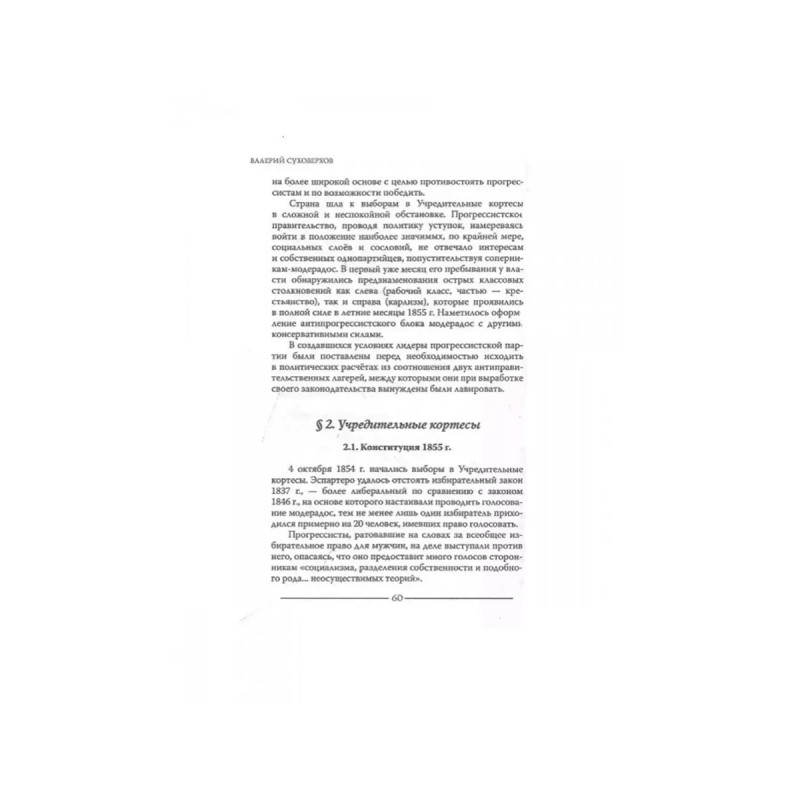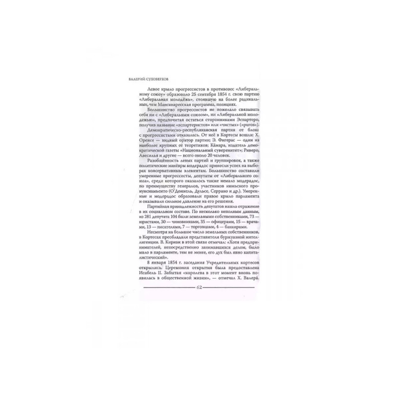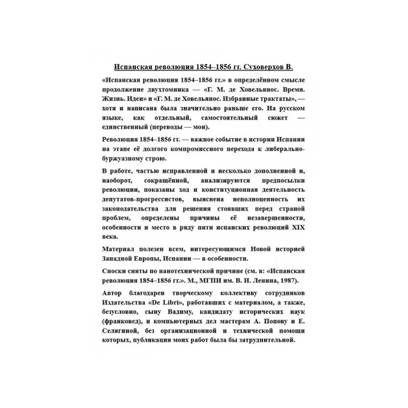 Испанская революция 1854-1856 гг. Суховерхов В. Испанская революция 18541856 гг. в определённом смысле продолжение двухтомника Г. М. де Ховельянос. Время. Жизнь. Идеи и Г. М. де Ховельянос. Избранные трактаты, хотя и написана была значительно раньше его. На русском языке, как отдельный, самостоятельный сюжет единственный (переводы мои). Революция 18541856 гг. важное событие в истории Испании на этапе её долгого компромиссного перехода к либерально-буржуазному строю. В работе, частью исправленной и несколько дополненной и, наоборот, сокращённой, анализируются предпосылки революции, показаны ход и конституционная деятельность депутатов-прогрессистов, выяснена неполноценность их законодательства для решения стоявших перед страной проблем, определены причины её незавершенности, особенности и место в ряду пяти испанских революций XIX века. Материал полезен всем, интересующимся Новой историей Западной Европы, Испании в особенности. Сноски сняты по нанотехнической причине (см. в: Испанская революция 18541856 гг.. М., МГПИ им. В. И. Ленина, 1987). Автор благодарен творческому коллективу сотрудников Издательства De Libri, работавших с материалом, а также, безусловно, сыну Вадиму, кандидату исторических наук (франковед), и компьютерных дел мастерам А. Попову и Е. Селягиной, без организационной и технической помощи которых, публикация моих работ была бы затруднительной.
