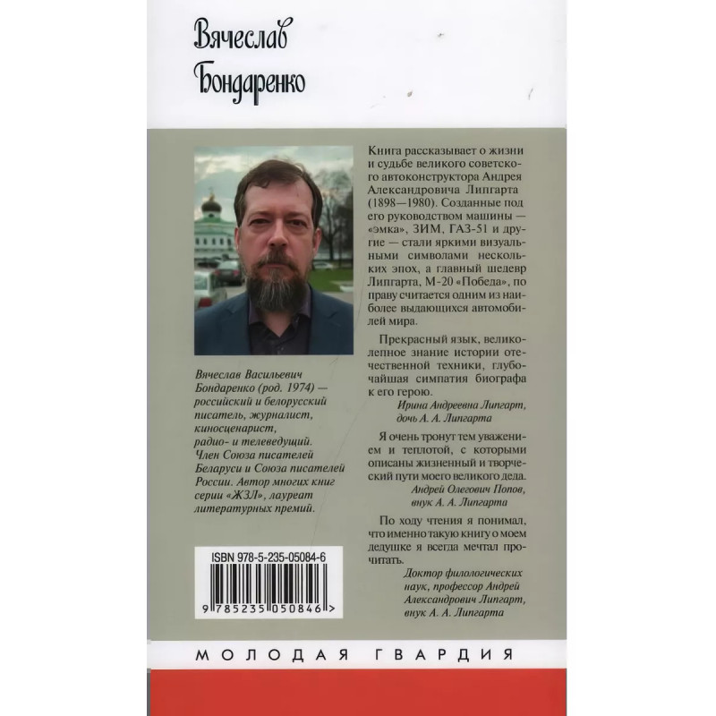 Липгарт: Создатель "Победы". Бондаренко В. В. Книга рассказывает о жизни и судьбе великого советского автоконструктора Андрея Александровича Липгарта (18981980). Созданные под его руководством машины эмка, ЗИМ, ГАЗ-51 и другие стали яркими визуальными символами нескольких эпох, а главный шедевр Липгарта, М-20 Победа, по праву считается одним из наиболее выдающихся автомобилей мира. В книге, созданной с опорой на документы семейного архива Липгартов и фондов Музея истории ГАЗ, подробно раскрывается история создания эпохальной Победы, много внимания уделено трудовому подвигу работников Горьковского автозавода во время Великой Отечественной войны, описана нелегкая судьба конструктора в послевоенные годы. Издание приурочено к 125-летию А. А. Липгарта и 80-летию начала работы над Победой.