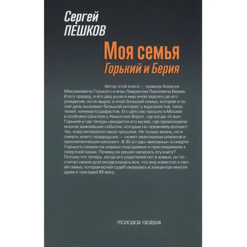 Моя семья: Горький и Берия. Пешков С. С. Автор этой книги правнук Алексея Максимовича Горького и внук Лаврентия Павловича Берии. И его прадед, и его дед ушли в мир иной до его рождения, но он вырос в этой большой семье, которая и по сей день вызывает большой интерес у журналистов, писателей, кинематографистов. Его детство прошло в Москве в особняке Шехтеля у Никитских ворот, где когда-то жил Горький и где теперь находится его музей, где происходили многие важнейшие события, которые по-прежнему волнуют тех, кому интересно наше прошлое. Не только жизнь, но и смерть его прадедушки сюжет авантюрных романов и приключенческих кинолент. В 30-е годы виновных в смерти Горького сажали на скамью подсудимых и приговаривали к смертной казни. Почему он решил написать эту книгу? Потому что теперь, когда его родителей нет в живых, он посчитал своим долгом рассказать все, что ему известно о своей семье, которая волей судеб оказалась в эпицентре многих драм и трагедий ХХ века.