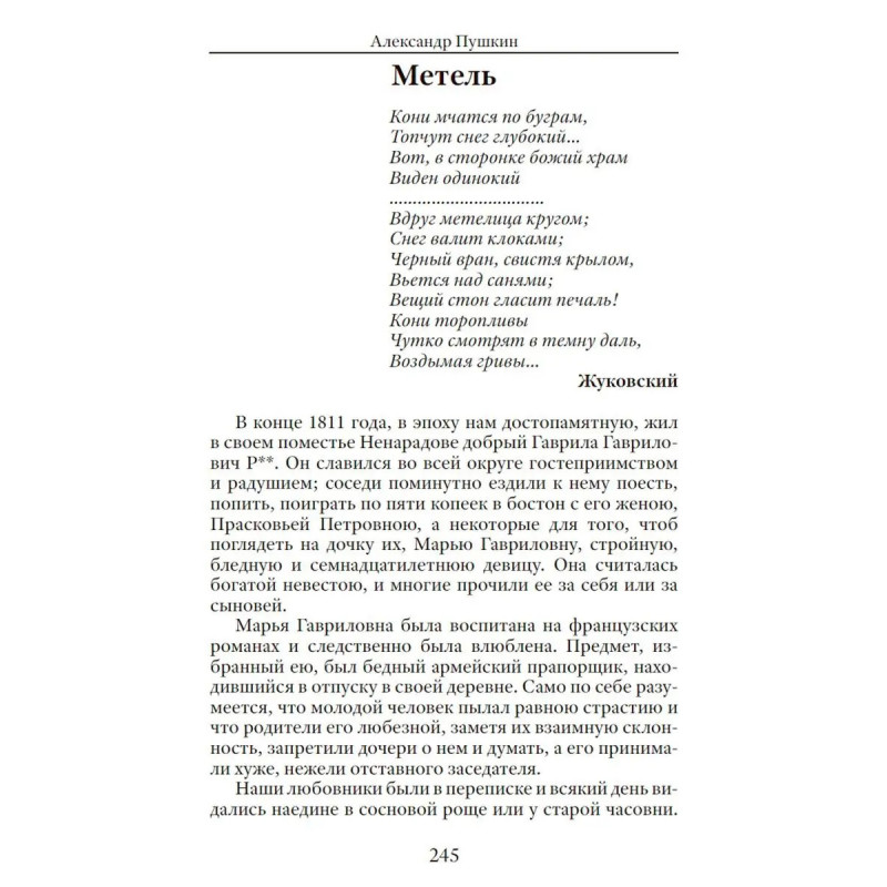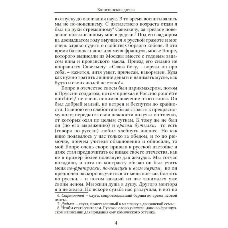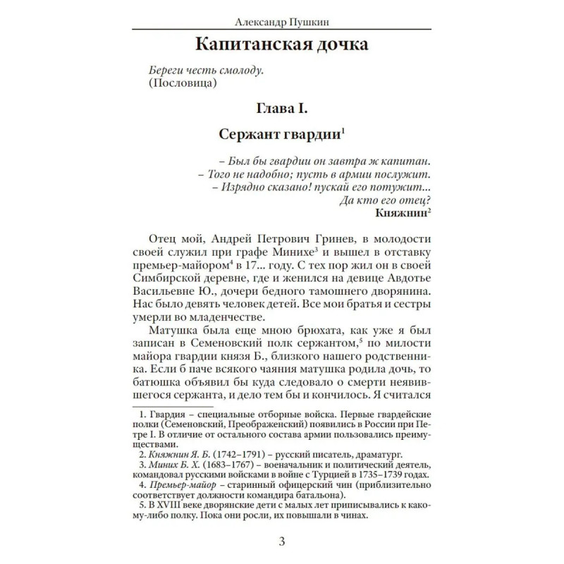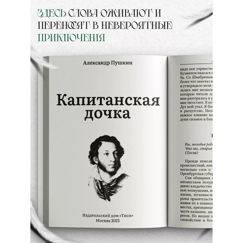 Капитанская дочка. Замысел повести об эпохе Емельяна Пугачёва возник у А. С. Пушкина, когда он работал над "Историей Пугачёвского бунта". Избрав для своего повествования жанр "семейной хроники", автор ввёл вымышленных героев в контекст реальных событий и персонажей. Повествование ведётся от лица дворянина-офицера Петра Гринёва человека чести и долга, верного своему слову, любимой женщине и родному Отечеству. Известный литературный критик Виссарион Белинский называл "Капитанскую дочку" "Онегиным" в прозе", "чудом совершенства" и отмечал, что Пушкин "изображает в ней нравы русского общества в царствование Екатерины". А Н. В. Гоголь признавался, что по сравнению с этим произведением Пушкина "все наши романы и повести кажутся приторною размазнею". "Капитанская дочка" была написана за год до гибели поэта и опубликована в журнале "Современник".