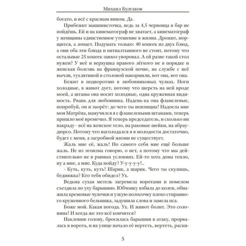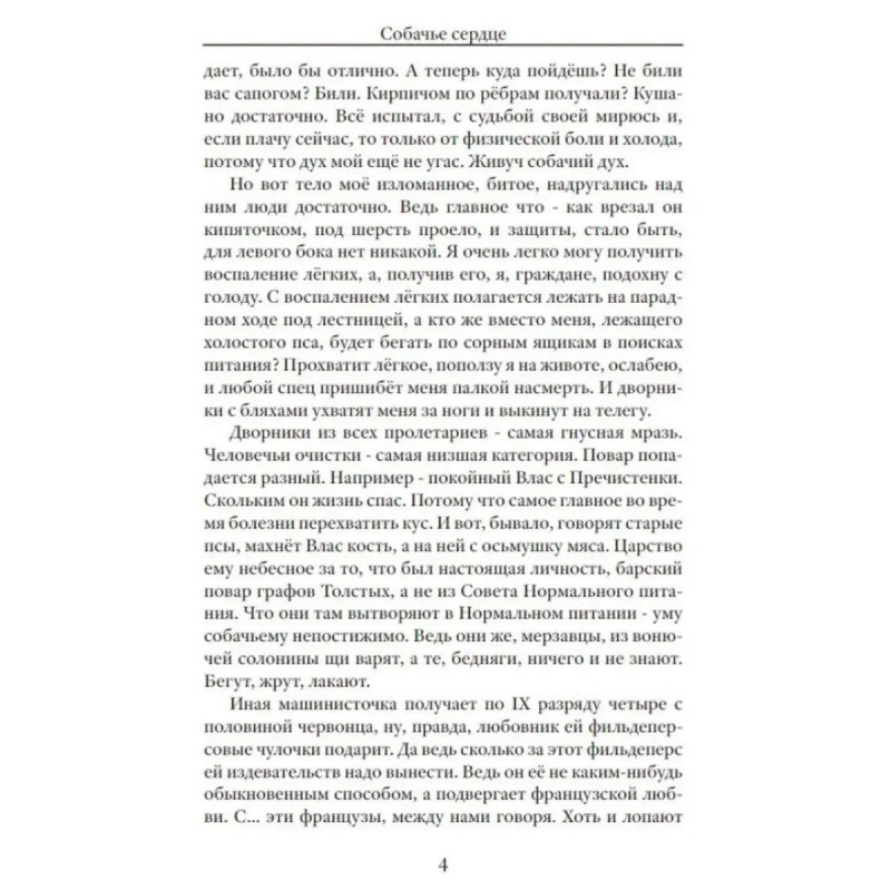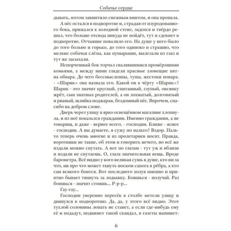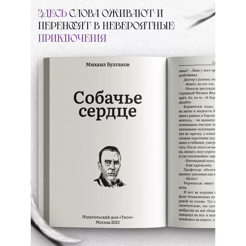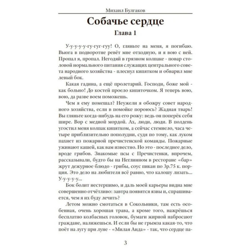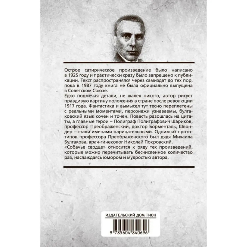 Собачье сердце. Острое сатирическое произведение было написано в 1925 году и практически сразу было запрещено к публикации. Текст распространялся через самиздат до тех пор, пока в 1987 году книга не была официально выпущена в Советском Союзе. Едко подмечая детали, не жалея никого, автор рисует правдивую картину положения в стране после революции 1917 года. Фантастика и вымысел тут тесно переплетены с реальными моментами, персонажи узнаваемы, булгаковский язык сочен и точен. Повесть разошлась на цитаты, а главные герои Полиграф Полиграфович Шариков, профессор Преображенский, доктор Борменталь, Швондер стали именами нарицательными. Одним из прототипов профессора Преображенского был дядя Михаила Булгакова, врач-гинеколог Николай Покровский. "Собачье сердце" относится к ряду тех произведений, которые можно перечитывать бесчисленное количество раз, наслаждаясь юмором и мудростью автора.