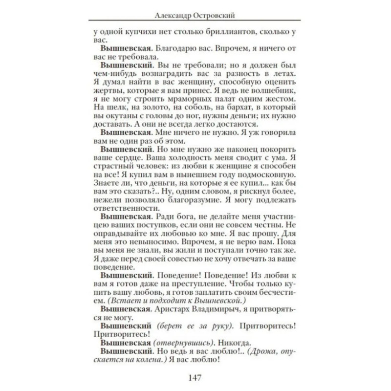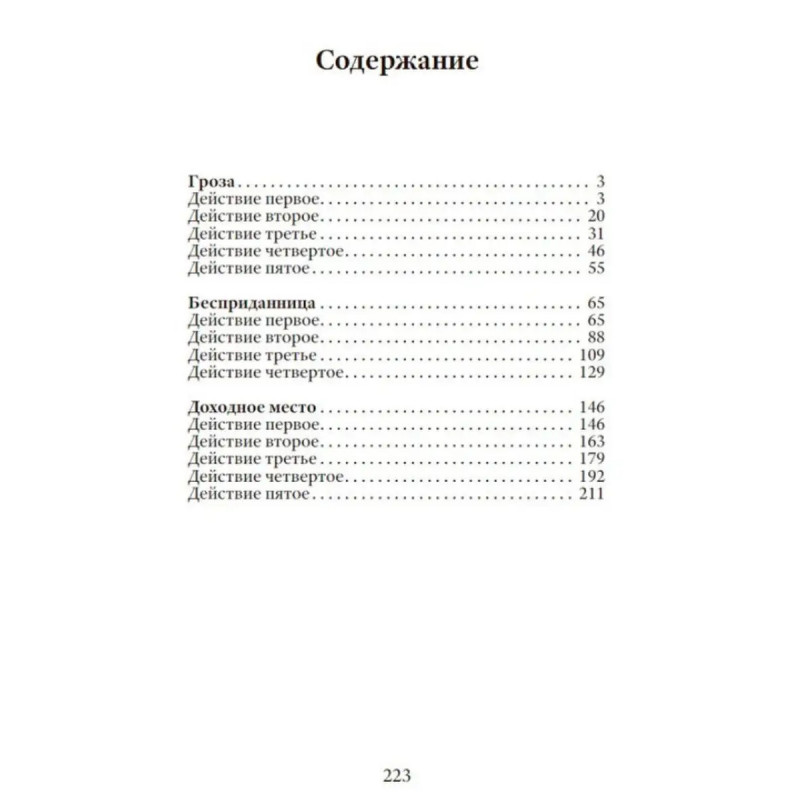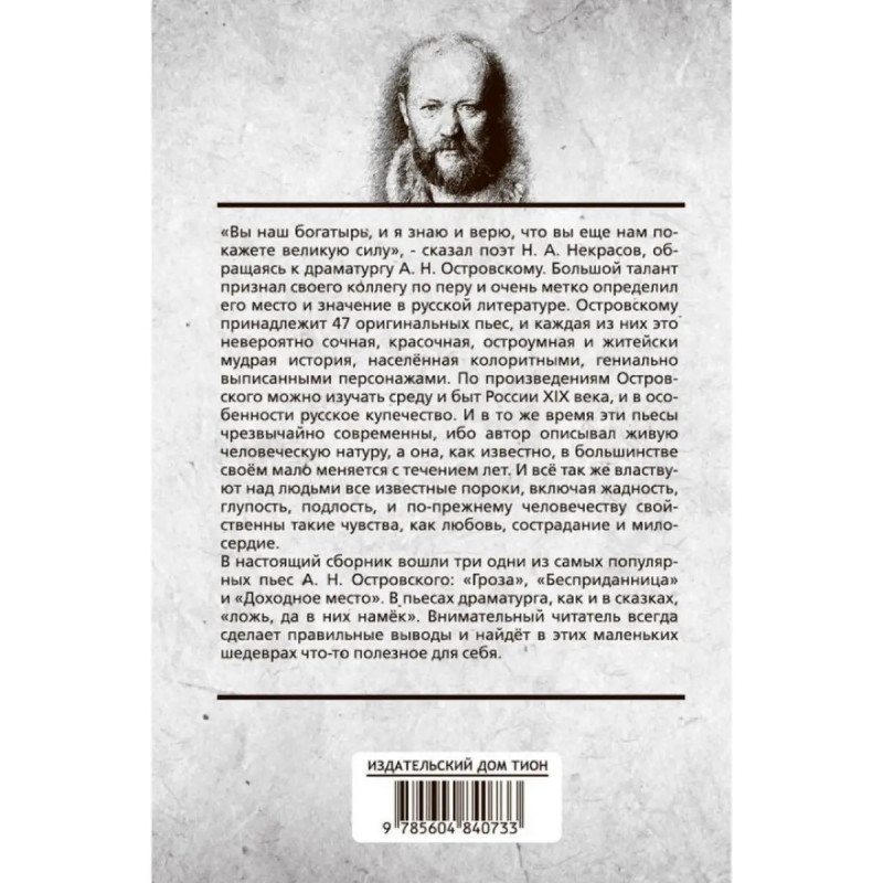 Гроза. "Вы наш богатырь, и я знаю и верю, что вы еще нам покажете великую силу", - сказал поэт Н. А. Некрасов, обращаясь к драматургу А. Н. Островскому. Большой талант признал своего коллегу по перу и очень метко определил его место и значение в русской литературе. Островскому принадлежит 47 оригинальных пьес, и каждая из них это невероятно сочная, красочная, остроумная и житейски мудрая история, населённая колоритными, гениально выписанными персонажами. По произведениям Островского можно изучать среду и быт России XIX века, и в особенности русское купечество. И в то же время эти пьесы чрезвычайно современны, ибо автор описывал живую человеческую натуру, а она, как известно, в большинстве своём мало меняется с течением лет. И всё так же властвуют над людьми все известные пороки, включая жадность, глупость, подлость, и по-прежнему человечеству свойственны такие чувства, как любовь, сострадание и милосердие. В настоящий сборник вошли три одни из самых популярных пьес А. Н. Островского: "Гроза", "Бесприданница" и "Доходное место". В пьесах драматурга, как и в сказках, "ложь, да в них намёк". Внимательный читатель всегда сделает правильные выводы и найдёт в этих маленьких шедеврах что-то полезное для себя.