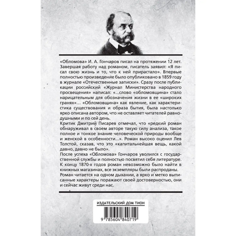 Обломов. Гончаров И. А. "Обломова" И. А. Гончаров писал на протяжении 12 лет. Завершая работу над романом, писатель заявил: "Я писал свою жизнь и то, что к ней прирастало". Впервые полностью произведение было опубликовано в 1859 году в журнале "Отечественные записки". Сразу после публикации российский "Журнал Министерства народного просвещения" написал: "... слово "обломовщина" стало нарицательным для обозначения жизни в ее "широких гранях" "Обломовщина" как явление, как характеристика существования и образа бытия, была настолько ярко описана автором, что не оставляет читателей равнодушными и по сей день. Критик Дмитрий Писарев отмечал, что "редкий роман обнаруживал в своем авторе такую силу анализа, такое полное и тонкое знание человеческой природы вообще и женской в особенности... ". Роман высоко оценил Лев Толстой, сказав, что это "капитальнейшая вещь, какой давно, давно не было". После успеха "Обломова" Гончаров уволился с государственной службы и полностью посвятил себя литературе. К концу 1870-х годов роман невозможно было найти в книжных магазинах, все экземпляры были распроданы. Роман читается на одном дыхании, а ярко и метко выписанные характеры поражают своей достоверностью, они и сейчас живут среди нас.
