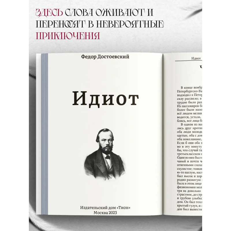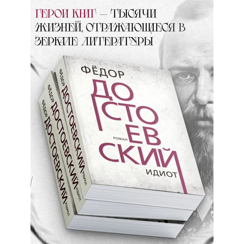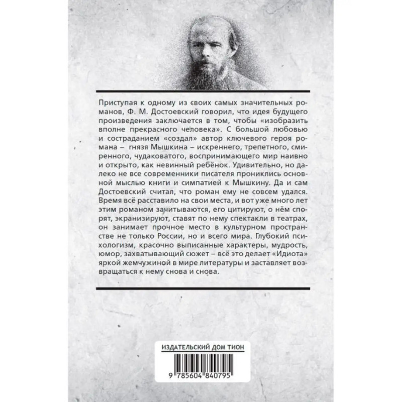 Идиот. Приступая к одному из своих самых значительных романов, Ф. М. Достоевский говорил, что идея будущего произведения заключается в том, чтобы "изобразить вполне прекрасного человека". С большой любовью и состраданием "создал" автор ключевого героя романа князя Мышкина искреннего, трепетного, смиренного, чудаковатого, воспринимающего мир наивно и открыто, как невинный ребёнок. Удивительно, но далеко не все современники писателя прониклись основной мыслью книги и симпатией к Мышкину. Да и сам Достоевский считал, что роман ему не совсем удался. Время всё расставило на свои места, и вот уже много лет этим романом зачитываются, его цитируют, о нём спорят, экранизируют, ставят по нему спектакли в театрах, он занимает прочное место в культурном пространстве не только России, но и всего мира. Глубокий психологизм, красочно выписанные характеры, мудрость, юмор, захватывающий сюжет всё это делает "Идиота" яркой жемчужиной в мире литературы и заставляет возвращаться к нему снова и снова.