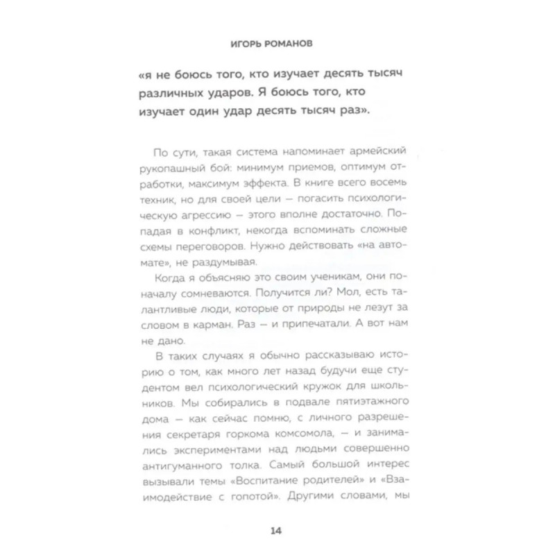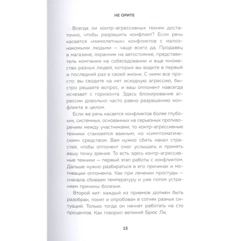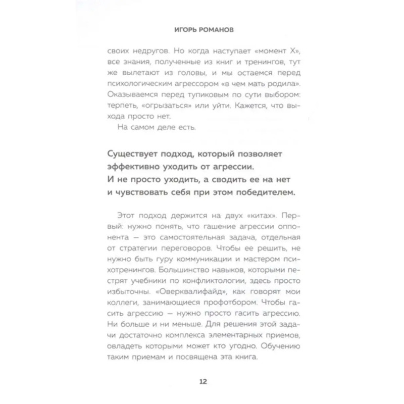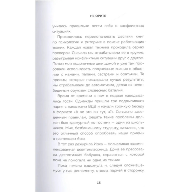 Не орите на меня! 8 способов ухода от психологической агрессии. Романов И. В. Выходить победителем из любой перепалки. Гасить конфликт парой фраз. Доброжелательно отстаивать свои границы и превращать врагов в хороших приятелей. Этому учит книга, написанная врачом-психиатром, психологом с тридцатилетним стажем, деканом факультета коммуникативного менеджмента РГСУ, бизнес-тренером Игорем Романовым. Он предлагает 8 проверенных техник, которые помогут свести на нет психологическую агрессию и дать возможность перейти к конструктивным переговорам.