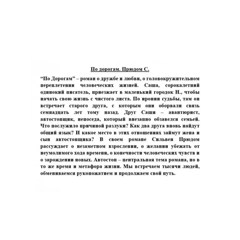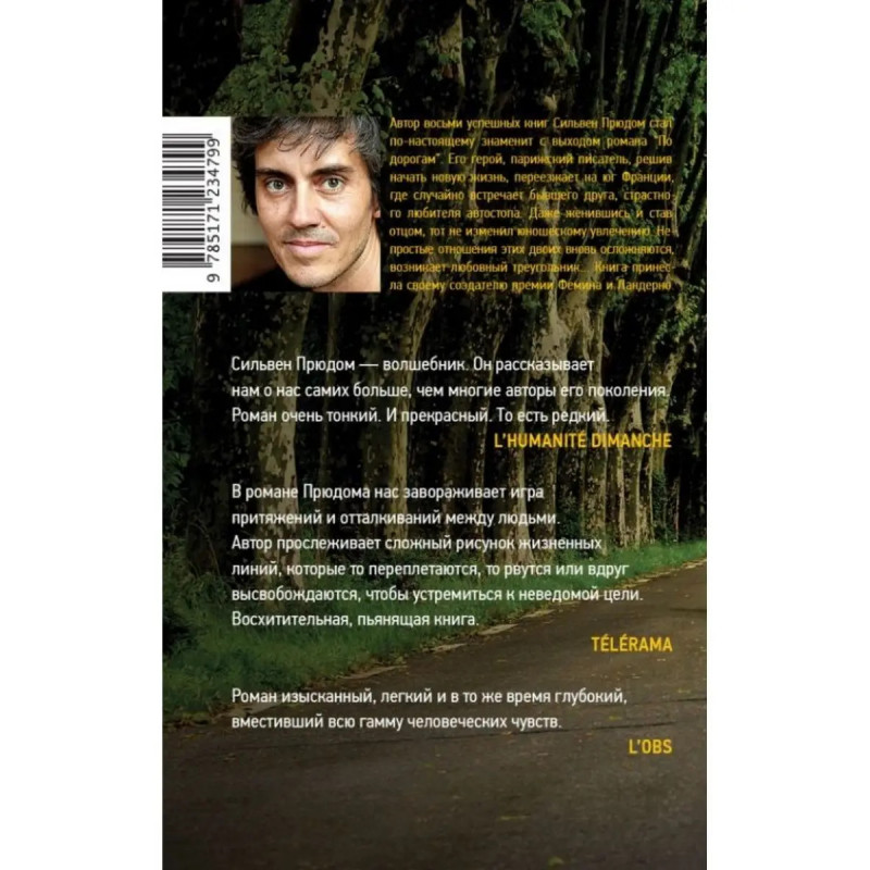 ISBN 9785-17123-4799. По дорогам. Прюдом С. По дорогам. Прюдом С. По Дорогам роман о дружбе и любви, о головокружительном переплетении человеческих жизней. Саша, сорокалетний одинокий писатель, приезжает в маленький городок Н., чтобы начать свою жизнь с чистого листа. По иронии судьбы, там он встречает старого друга, с которым они оборвали связь семнадцать лет тому назад. Друг Саши авантюрист, автостопщик, непоседа, который внезапно обзавелся семьей. Что послужило причиной разлуки? Как два друга вновь найдут общий язык? И какое место в этих отношениях займут жена и сын автостопщика? В своем романе Сильвен Прюдом рассуждает о незаметном взрослении, о желании убежать от неумолимого хода времени, о конечности человеческих чувств и о зарождении новых. Автостоп центральная тема романа, но в то же время и метафора жизни. Мы встречаем тысячи людей, обмениваемся рукопожатием и продолжаем свой путь. Переводчики: Кузнецова Ирина Исаевна, Стаф Ирина Карловна.