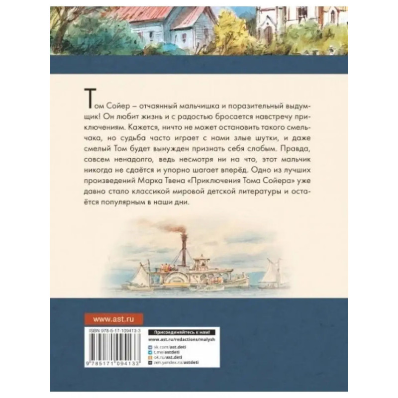 ISBN 9785-17109-4133. Приключения Тома Сойера. "Приключения Тома Сойера" один из шедевров мировой детской литературы, созданный в 1875 году американским писателем Марком Твеном (настоящее имя - Сэмюэл Ленгхорн Клеменс). Вот уже полтора столетия приключения озорника и выдумщика Тома и его друга Гека Финна из провинциального американского городка под названием Санкт-Петербург на берегу Миссисипи завораживают и увлекают современных читателей. Интересный сюжет и оригинальные характеры героев поднимают эту повесть на небывалую высоту. В издании представлен классический перевод К. Чуковского. Иллюстрации В. Челака. Для среднего школьного возраста.
