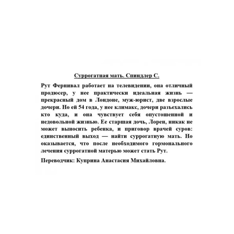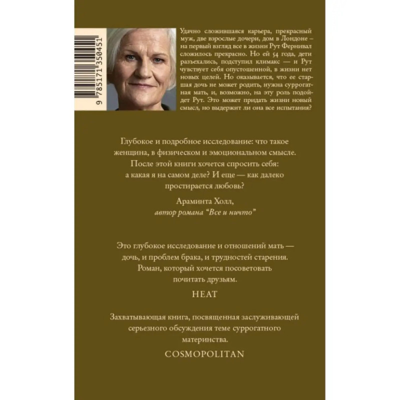 ISBN 9785-17135-0451. Суррогатная мать. Спиндлер С. Суррогатная мать. Спиндлер С. Рут Фернивал работает на телевидении, она отличный продюсер, у нее практически идеальная жизнь прекрасный дом в Лондоне, муж-юрист, две взрослые дочери. Но ей 54 года, у нее климакс, дочери разъехались кто куда, и она чувствует себя опустошенной и недовольной жизнью. Ее старшая дочь, Лорен, никак не может выносить ребенка, и приговор врачей суров: единственный выход найти суррогатную мать. Но оказывается, что после необходимого гормонального лечения суррогатной матерью может стать Рут. Переводчик: Куприна Анастасия Михайловна.