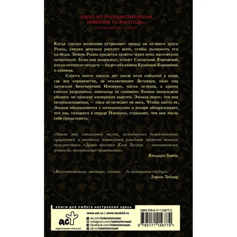 ISBN 9785-17115-6770. Дитя ярости. Легран К. Когда группа ассасинов устраивает засаду на лучшего друга Риэль, смелая девушка рискует всем, чтобы вызволить его из беды. Теперь Риэль придется пройти через семь магических испытаний. Если она выдержит, станет Солнечной Королевой, а если потерпит неудачу будет объявлена Кровавой Королевой и казнена. Спустя почти тысячу лет после этих событий в мире, где все королевства, за исключением Аставара, пали под натиском Бессмертной Империи, магия исчезла, а храмы святых разрушены, охотница за головами Элиана вынуждена убивать по приказу имперских властей. Элиана верит, что она неприкосновенна, пока не исчезает ее мать. Чтобы найти ее, Элиана объединяется с мятежниками и вскоре обнаруживает, что зло, таящееся в сердце Империи, страшнее, чем она могла себе представить.