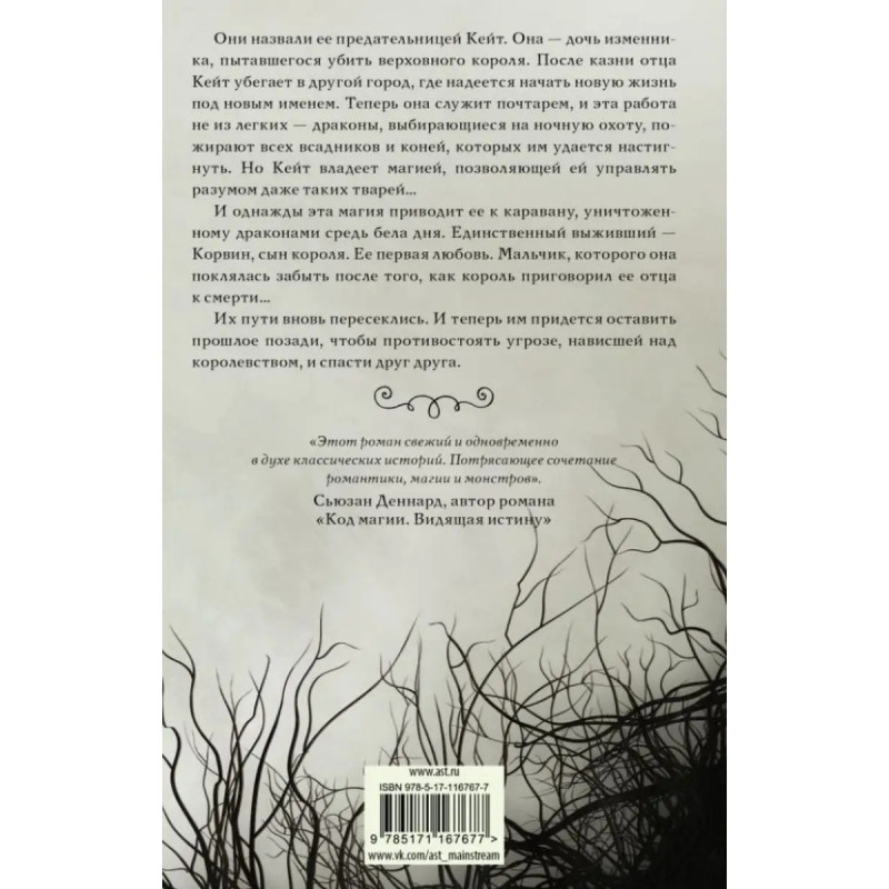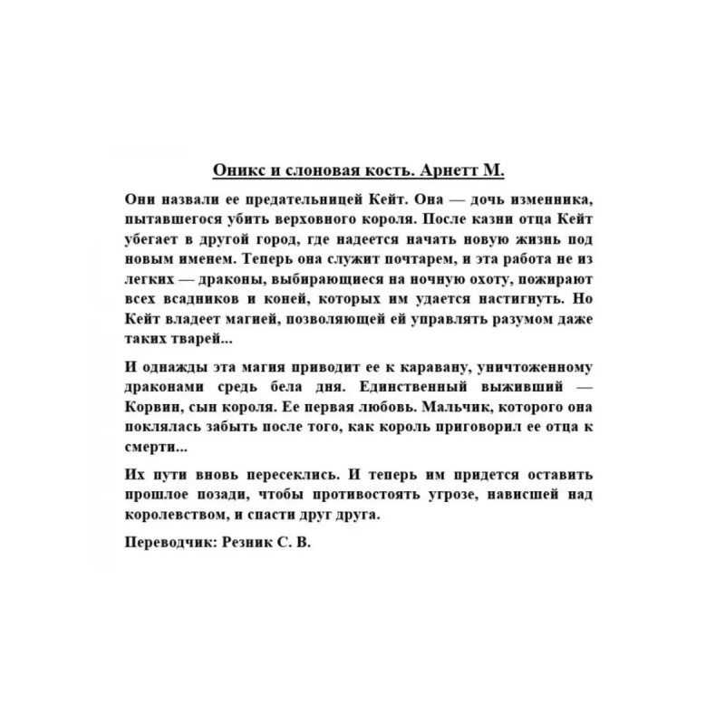 ISBN 9785-17116-7677. Оникс и слоновая кость. Арнетт М. Оникс и слоновая кость. Арнетт М. Они назвали ее предательницей Кейт. Она дочь изменника, пытавшегося убить верховного короля. После казни отца Кейт убегает в другой город, где надеется начать новую жизнь под новым именем. Теперь она служит почтарем, и эта работа не из легких драконы, выбирающиеся на ночную охоту, пожирают всех всадников и коней, которых им удается настигнуть. Но Кейт владеет магией, позволяющей ей управлять разумом даже таких тварей... И однажды эта магия приводит ее к каравану, уничтоженному драконами средь бела дня. Единственный выживший Корвин, сын короля. Ее первая любовь. Мальчик, которого она поклялась забыть после того, как король приговорил ее отца к смерти... Их пути вновь пересеклись. И теперь им придется оставить прошлое позади, чтобы противостоять угрозе, нависшей над королевством, и спасти друг друга. Переводчик: Резник С. В.