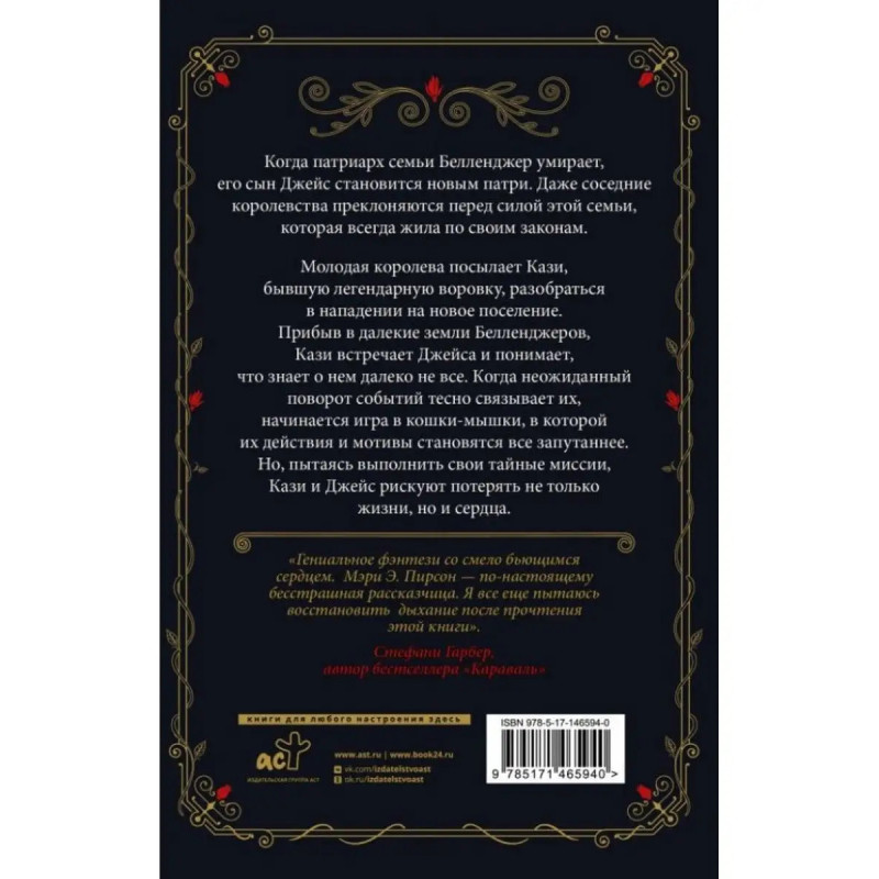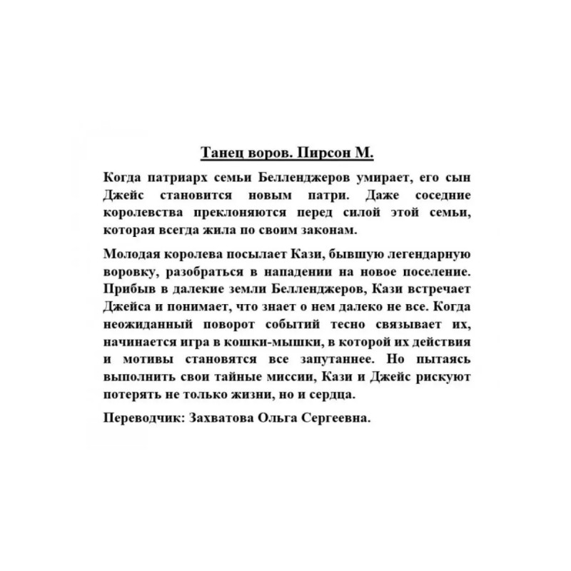 ISBN 9785-17146-5940. Танец воров. Пирсон М. Танец воров. Пирсон М. Когда патриарх семьи Белленджеров умирает, его сын Джейс становится новым патри. Даже соседние королевства преклоняются перед силой этой семьи, которая всегда жила по своим законам. Молодая королева посылает Кази, бывшую легендарную воровку, разобраться в нападении на новое поселение. Прибыв в далекие земли Белленджеров, Кази встречает Джейса и понимает, что знает о нем далеко не все. Когда неожиданный поворот событий тесно связывает их, начинается игра в кошки-мышки, в которой их действия и мотивы становятся все запутаннее. Но пытаясь выполнить свои тайные миссии, Кази и Джейс рискуют потерять не только жизни, но и сердца.