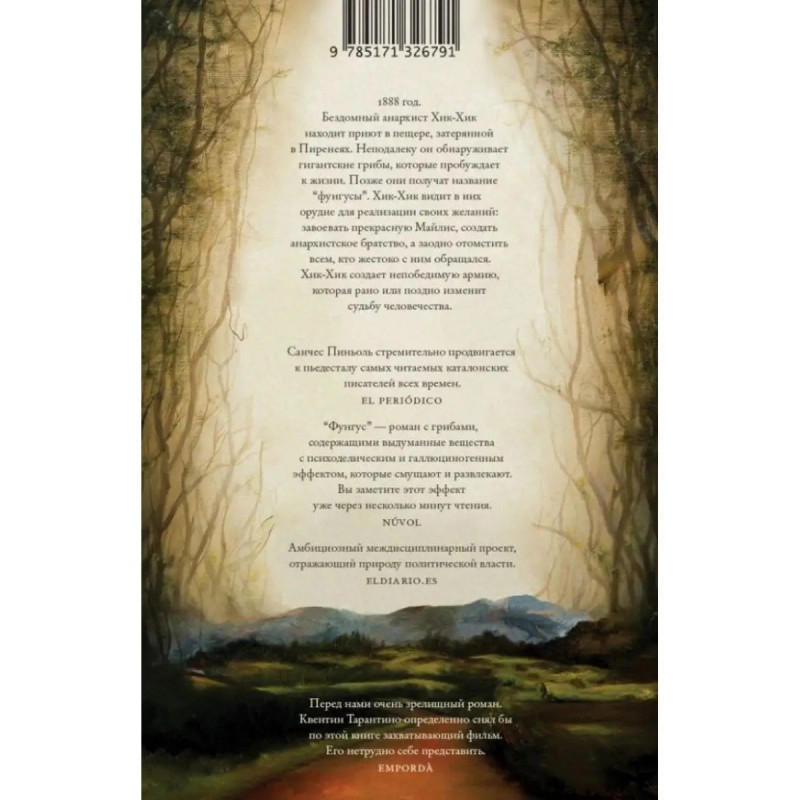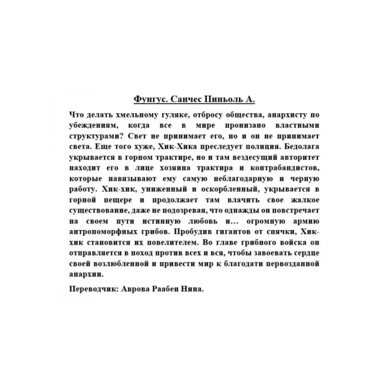 ISBN 9785-17132-6791. Фунгус. Санчес Пиньоль А. Фунгус. Санчес Пиньоль А. Что делать хмельному гуляке, отбросу общества, анархисту по убеждениям, когда все в мире пронизано властными структурами? Свет не принимает его, но и он не принимает света. Еще того хуже, Хик-Хика преследует полиция. Бедолага укрывается в горном трактире, но и там вездесущий авторитет находит его в лице хозяина трактира и контрабандистов, которые навязывают ему самую неблагодарную и черную работу. Хик-хик, униженный и оскорбленный, укрывается в горной пещере и продолжает там влачить свое жалкое существование, даже не подозревая, что однажды он повстречает на своем пути истинную любовь и огромную армию антропоморфных грибов. Пробудив гигантов от спячки, Хик-хик становится их повелителем. Во главе грибного войска он отправляется в поход против всех и вся, чтобы завоевать сердце своей возлюбленной и привести мир к благодати первозданной анархии. Переводчик: Аврова Раабен Нина.