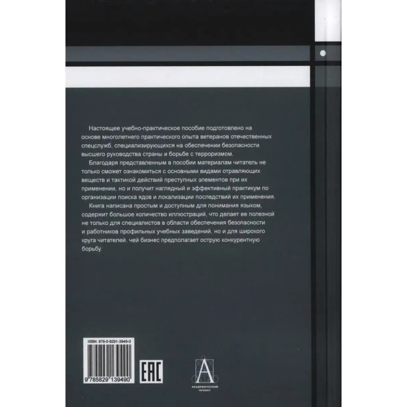 ISBN 9785-82913-9490. Организация противодействия нападениям с применением отравляющих веществ (ядов). Настоящее учебно-практическое пособие подготовлено на основе многолетнего практического опыта ветеранов отечественных спецслужб, специализирующихся на обеспечении безопасности высшего руководства страны и борьбе с терроризмом. Благодаря представленным в пособии материалам читатель не только сможет ознакомиться с основными видами отравляющих веществ и тактикой действий преступных элементов при из применении, но и получит наглядный и эффективный практикум по организации поиска ядов и локализации их применения. Книга написана простым и доступным для понимания языком, содержит большое количество иллюстраций, что делает ее полезной не только для специалистов в области обеспечения безопасности и работников профильных учебных заведений, но и для широкого круга читателей, чей бизнес предполагает острую конкурентную борьбу. 2-е издание.