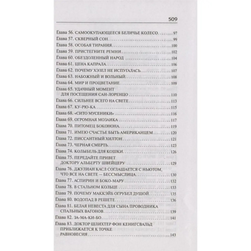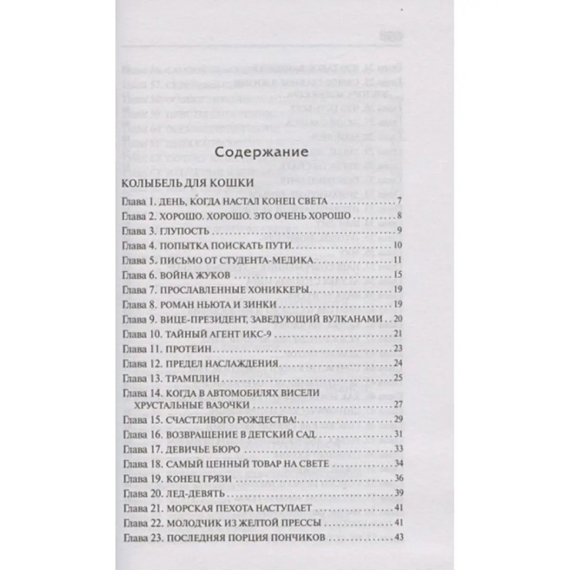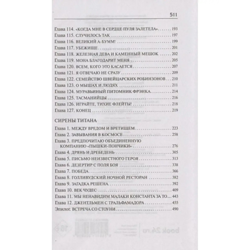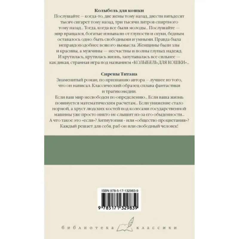 ISBN 9785-17132-9839. Колыбель для кошки. Сирены Титана. Послушайте когда-то, две жены тому назад, двести пятьдесят тысяч сигарет тому назад, три тысячи литров спиртного тому назад... Тогда, когда все были молоды... Послушайте мир вращался, богатые изнывали от глупости и скуки, бедным оставалось одно быть свободными и умными. Правда была неправдоподобнее всякого вымысла. Женщины были злы и красивы, а мужчины несчастны и полны глупых надежд. И крутилась, крутилась жизнь, запутывалась все сильнее как дикая, странная игра под названием "КОЛЫБЕЛЬ ДЛЯ КОШКИ"...