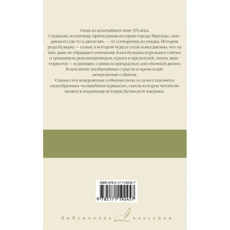 ISBN 9785-17119-2457. Сто лет одиночества. Гарсиа. Габриэль Гарсиа Маркес величайший писатель ХХ века, лауреат Нобелевской премии, автор всемирно известных романов "Сто лет одиночества", "Любовь во время чумы" и "Осень патриарха". Одна из величайших книг ХХ века. Странная, поэтичная, причудливая история города Макондо, затерянного где-то в джунглях, - от сотворения до упадка. История рода Буэндиа - семьи, в которой чудеса столь повседневны, что на них даже не обращают внимания. Клан Буэндиа порождает святых и грешников, революционеров, героев и предателей, лихих авантюристов - и женщин, слишком прекрасных для обычной жизни. В нем кипят необычайные страсти - и происходят невероятные события. Однако эти невероятные события снова и снова становятся своеобразным "волшебным зеркалом", сквозь которое читателю является подлинная история Латинской Америки