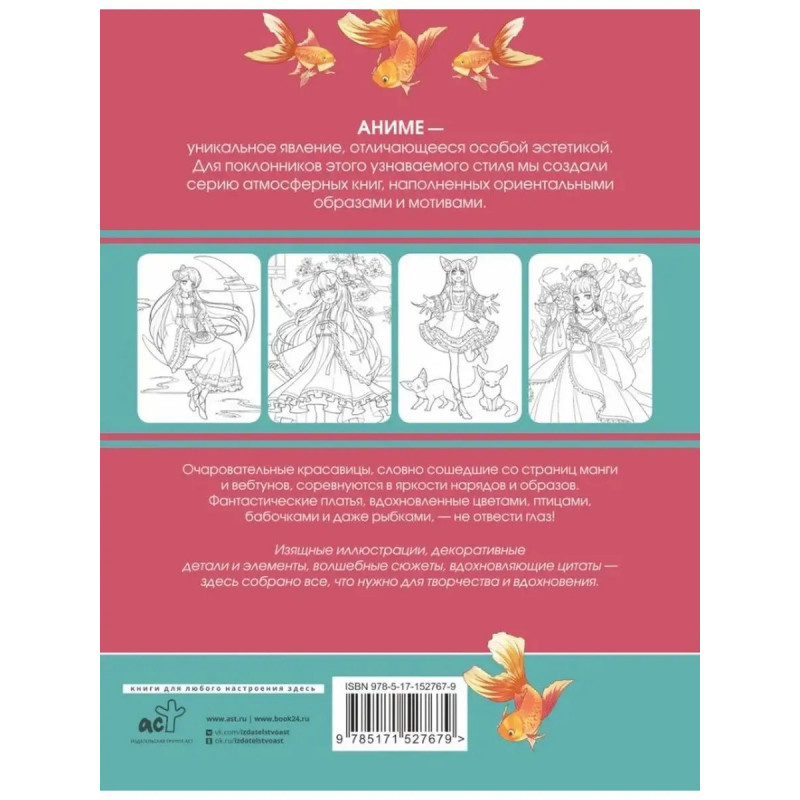 ISBN 9785-17152-7679. Anime Art. Наряд для Лолиты. Книга для творчества в стиле аниме и манга. Шу С., Бянь Э. Аниме уникальное явление, отличающееся особой эстетикой. Для поклонников этого узнаваемого стиля мы создали серию атмосферных книг, наполненных ориентальными образами и мотивами. Очаровательные красавицы, словно сошедшие со страниц манги и вебтунов, соревнуютсяв яркости нарядов и образов. Фантастические платья, вдохновленные цветами, птицами, бабочками и даже рыбками, не отвести глаз!Изящные иллюстрации, декоративные детали и элементы, волшебные сюжеты, вдохновляющие цитаты здесь собрано все, что нужно для творчества и вдохновения.