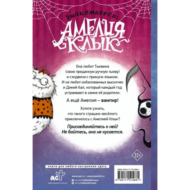 ISBN 9785-17151-5881. Амелия Клык и Дикий бал. Она любит Тыквика (свою преданную ручную тыкву) и сэндвичи с прикуси-языком. И не любит избалованных выскочек и Дикий бал, который каждый год устраивают в замке её родители. А ещё Амелия вампир! Хотите узнать, что такого страшно-весёлого приключилось с Амелией Клык? Присоединяйтесь к ней. Не бойтесь, она не кусается.