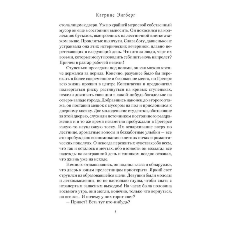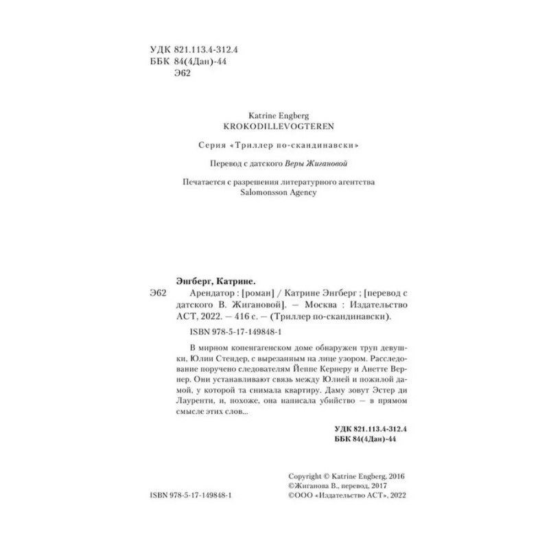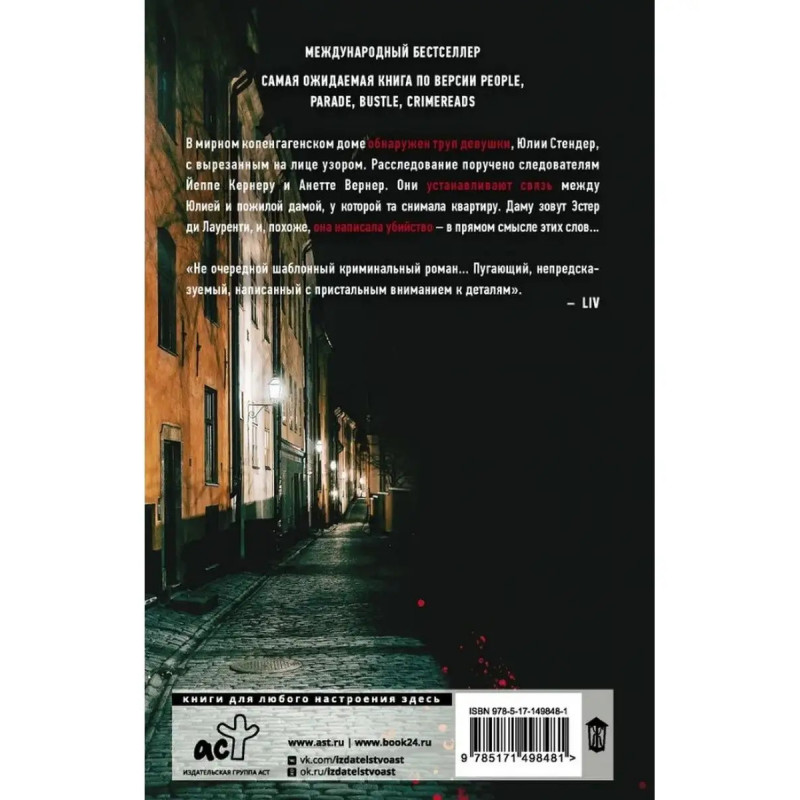 ISBN 9785-17149-8481. Арендатор. Энгберг К. В мирном копенгагенском доме обнаружен труп девушки, Юлии Стендер, с вырезанным на лице узором. Расследование поручено следователям Йеппе Кернеру и Анетте Вернер. Они устанавливают связь между Юлией и пожилой дамой, у которой та снимала квартиру. Даму зовут Эстер ди Лауренти, и, похоже, она написала убийство в прямом смысле этих слов