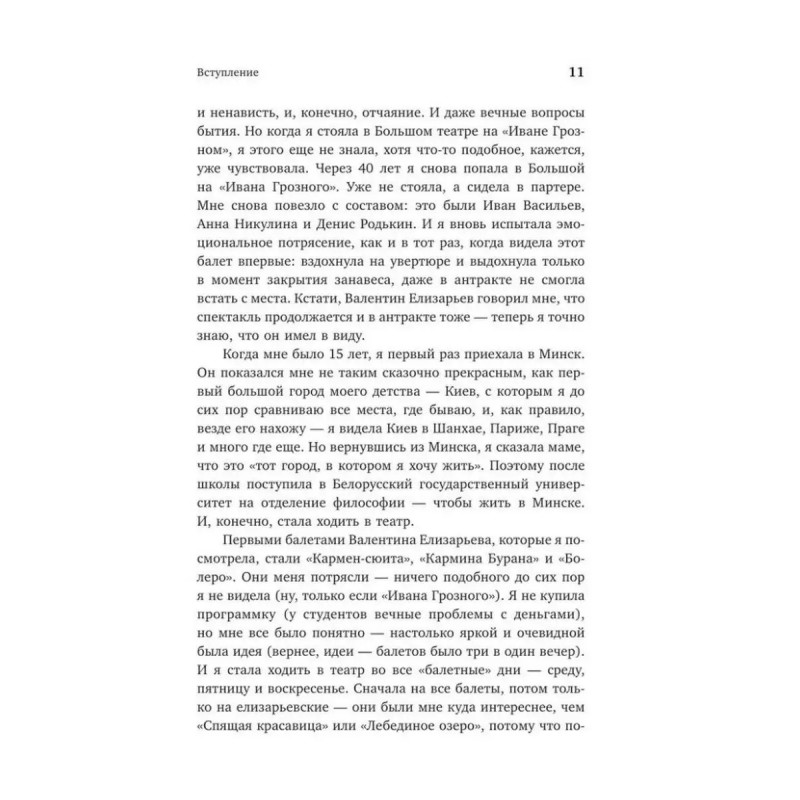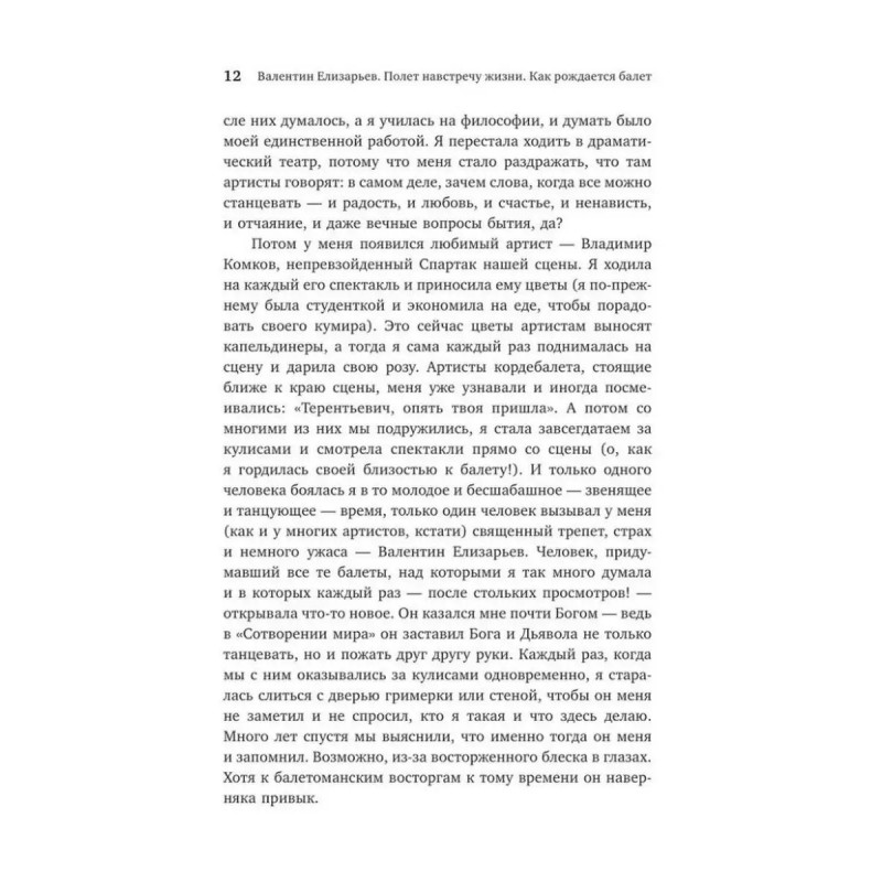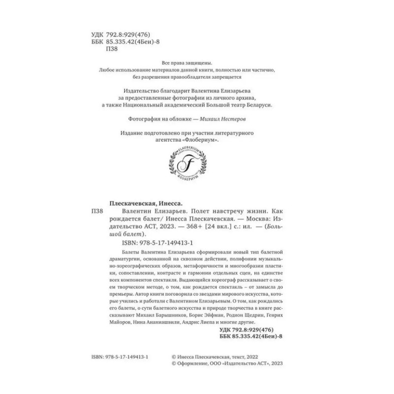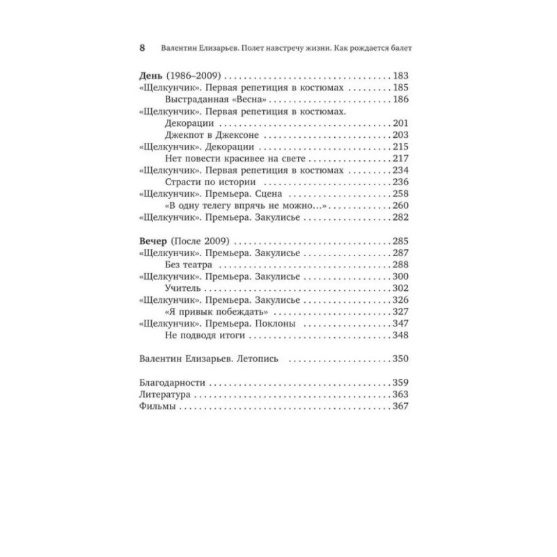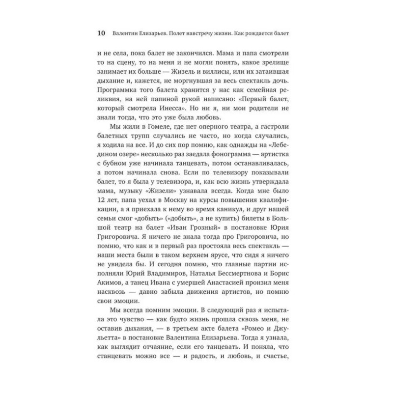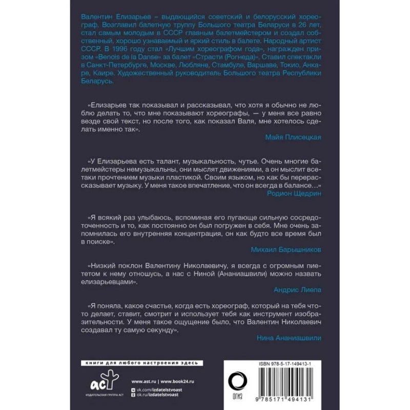 ISBN 9785-17149-4131. Валентин Елизарьев. Полет навстречу жизни. Как рождается балет. Плескачевская И. Балеты Валентина Елизарьева сформировали новый тип балетной драматургии, основанной на сквозном действии, полифонии музыкально-хореографических образов, метафоричности и многообразии пластики, сопоставлении, контрасте и гармонии отдельных сцен, на единстве всех компонентов спектакля. Выдающийся хореограф рассказывает о своем творческом методе, о том, как рождается спектакль от замысла до премьеры. Автор книги поговорила со звездами мирового искусства, которые учились и работали с Валентином Елизарьевым. О том, как рождались его балеты, о сути балетного искусства и природе творчества в книге рассказывают Михаил Барышников, Борис Эйфман, Родион Щедрин, Генрих Майоров, Нина Ананиашвили, Андрис Лиепа и многие другие.