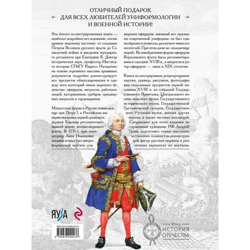 ISBN 9785-87849-2478. Русский морской костюм от Петра Великого до Елизаветы Петровны. Русский морской костюм от Петра Великого до Елизаветы Петровны. Назаренко К. Б. Отличный подарок для всех любителей униформологии и военной истории!Эта богато иллюстрированная книга - наиболее подробное исследование, посвященное морскому костюму от создания Петром Великим русского флота до Семилетней войны и введения мундирного регламента при Екатерине II. Доктор исторических наук, профессор Института истории СПбГУ Кирилл Назаренко, на основе огромного массива архивных документов, подробно реконструирует все предметы обмундирования и одежду всех категорий чинов морского ведомства: офицеров, матросов, работных людей, каторжников, гребцов, придворных матросов и гардемаринов. Матросская форма в России появилась еще при Петре I, а Российская Империя оказалась первой среди всех держав Европы регламентировавшей форму военно-морского флота. В 1735 г. при императрице Анне Иоанновне впервые в мире был введен форменный костюм для морских офицеров, имевший все признаки современной униформы, - он был единообразен и позволял различать чины его носителей костюм. При этом даже во "Владычице морей" Великобритании форма офицеров Королевского флота была регламентирована в середине XVIII в., а матросов и унтер-офицеров лишь в XIX столетии. Книга иллюстрирована репродукциями картин, гравюр, рисунков, фотографиями подлинных предметов первой половины XVIII в. из собраний Государственного Эрмитажа, Центрального военно-морского музея, Государственного Исторического музея, Государственной Третьяковской галереи, Государственного Русского музея, многих других музеев, а также частных коллекций. Специально для этого издания заслуженный художник РФ Андрей Тронь подготовил серию высококачественных планшетов-реконструкций фигур русских моряков в различных вариантах их костюма.