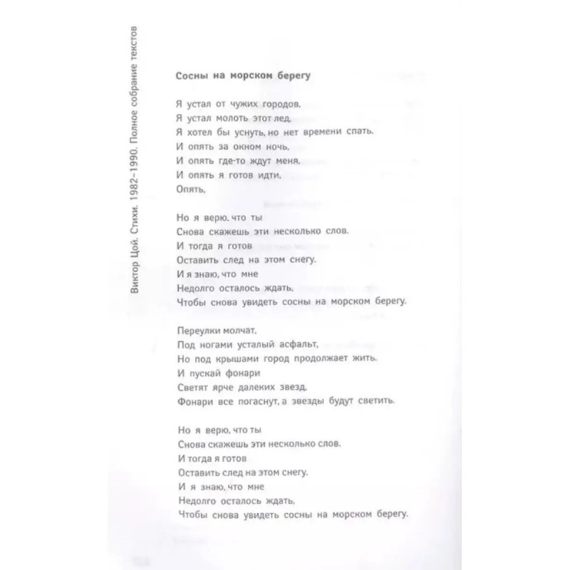 Стихи. 1982-1990. Полное собрание текстов. Цой В. Р. Виктора Цоя по праву можно назвать знаковой фигурой для русской литературы конца ХХ века. Он был человеком большого дарования, что подтверждает неиссякаемый интерес к его поэзии на протяжении вот уже сорока лет. Универсальные образы, знакомые всем символы каждый раз прочитываются в новых контекстах и при-обретают новые значения. Именно поэтому каждое новое поколение заново открывает для себя поэзию Цоя. В книгу вошел весь корпус текстов, написанных Цоем в период с 1982 по 1990 год, а также редкие фотографии, черновики, автографы и артефакты. По сохранившимся фотокопиям черновиков в части стихотворений восстановлена авторская орфография и пунктуация, в остальных текстах пунктуация приведена в соответствие с современными нормами.