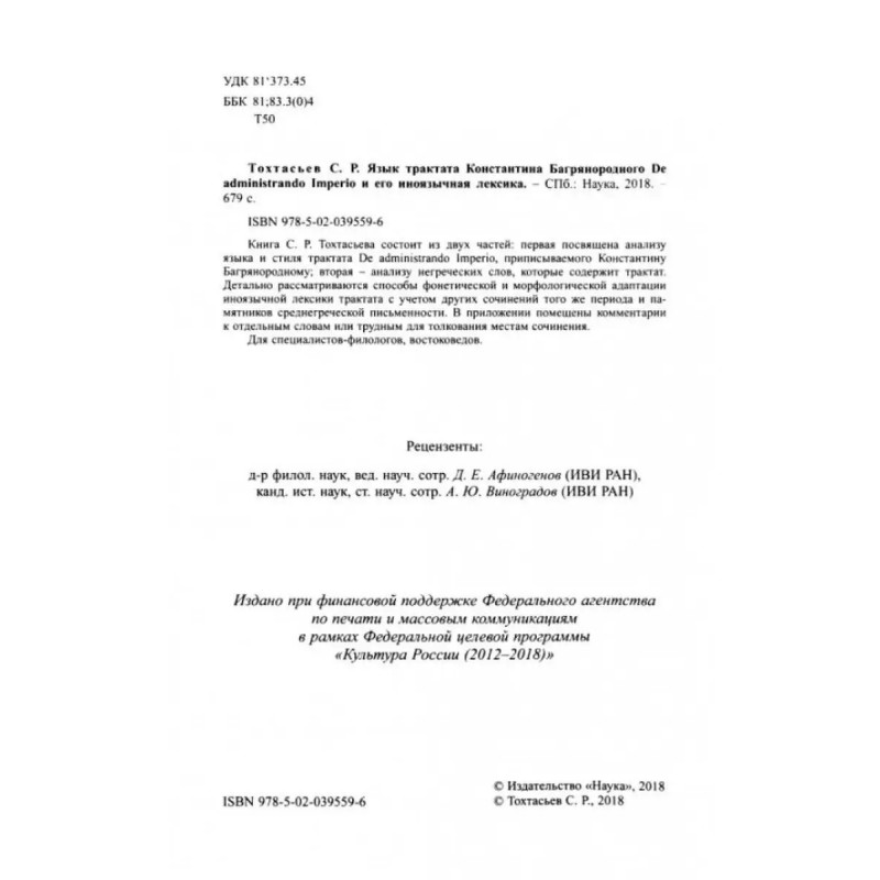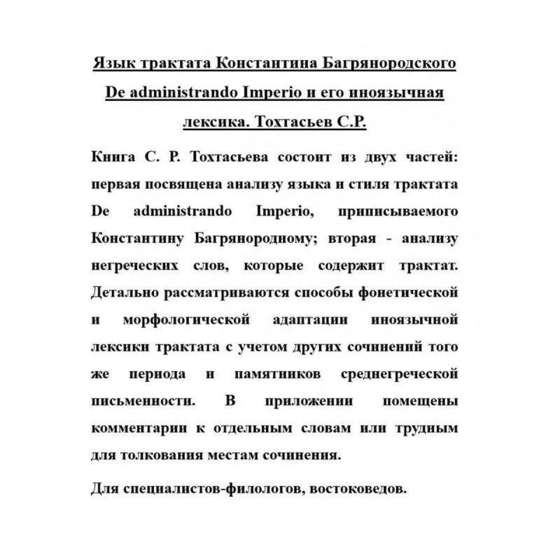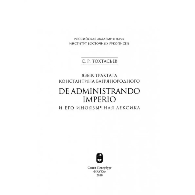 Язык трактата Константина Багрянородского De administrando Imperio и его иноязычная лексика. Тохтасьев С. Р. Книга С. Р. Тохтасьева состоит из двух частей: первая посвящена анализу языка и стиля трактата De administrando Imperio, приписываемого Константину Багрянородному; вторая - анализу негреческих слов, которые содержит трактат. Детально рассматриваются способы фонетической и морфологической адаптации иноязычной лексики трактата с учетом других сочинений того же периода и памятников среднегреческой письменности. В приложении помещены комментарии к отдельным словам или трудным для толкования местам сочинения. для специалистов-филологов, востоковедов.