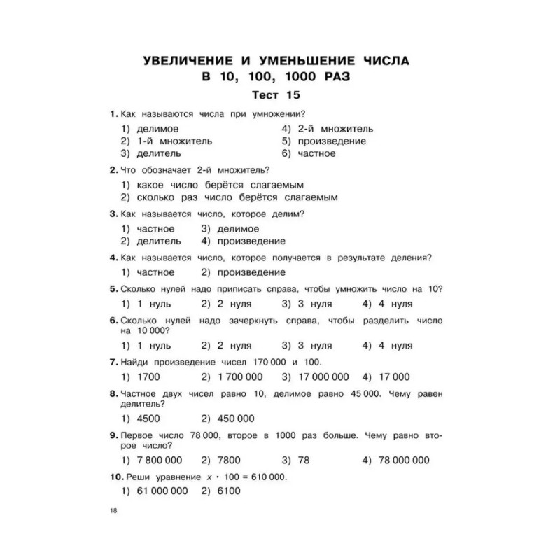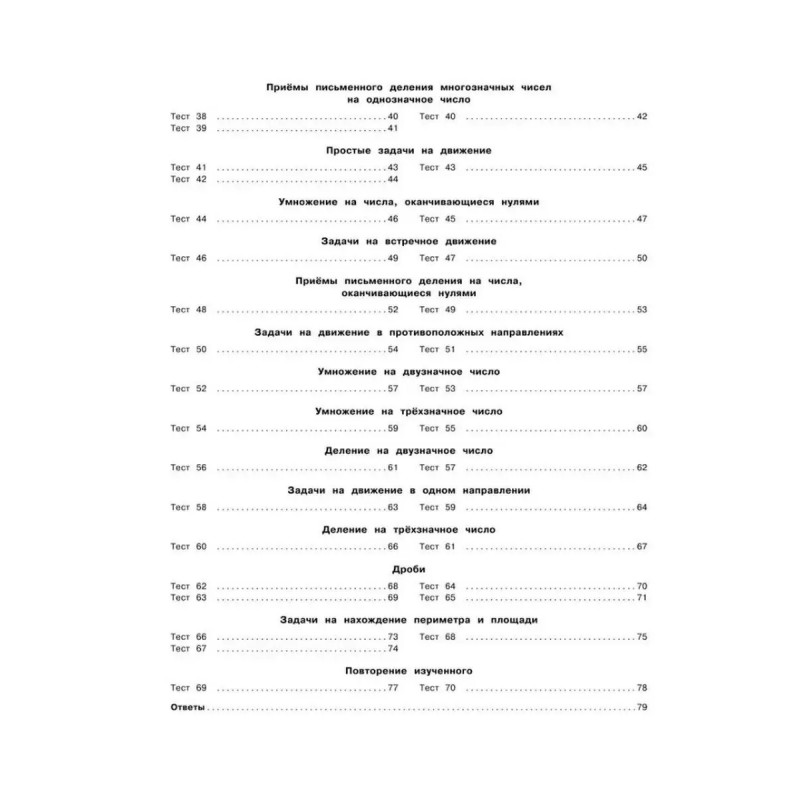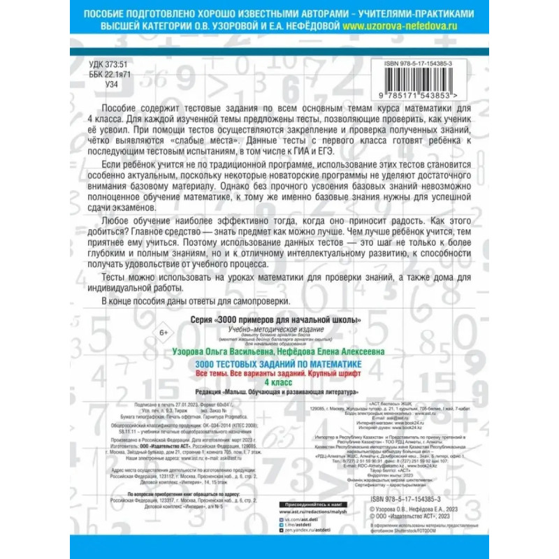 3000 тестовых заданий по математике. 4 класс. Крупный шрифт. Все темы и варианты. Узорова О. В., Нефедова Е. А. Пособие содержит тестовые задания по всем основным темам курса математики для 4 класса. Для каждой изученной темы предложены тесты, позволяющие проверить, как ученик её усвоил. При помощи тестов осуществляются закрепление и проверка полученных знаний, чётко выявляются слабые места. Данные тесты с первого класса готовят ребёнка к последующим тестовым испытаниям, в том числе к ГИА и ЕГЭ. В конце книги для самопроверки даны ответы на все задания тестов. Пособие можно использовать на уроках математики, а также для самостоятельных занятий дома.