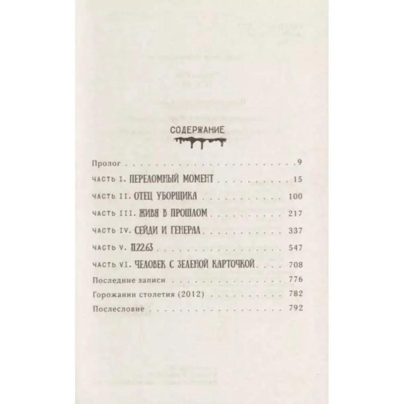 11/22/63. Этот роман безоговорочно признают лучшей книгой Стивена Кинга и миллионы фанатов писателя, и серьезные литературные критики. Убийство президента Кеннеди стало самым трагическим событием американской истории ХХ века. Тайна его до сих пор не раскрыта. Но что, если случится чудо? Если появится возможность отправиться в прошлое и предотвратить катастрофу?Это предстоит выяснить обычному учителю из маленького городка Джейку Эппингу, получившему доступ к временному порталу. Его цель - спасти Кеннеди. Но какова будет цена спасения?