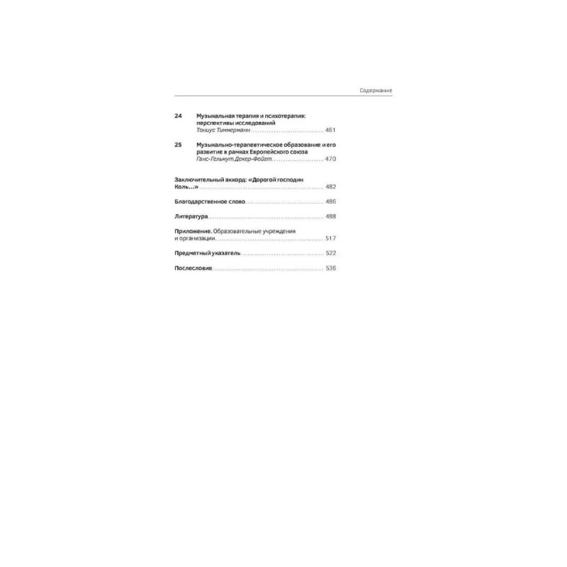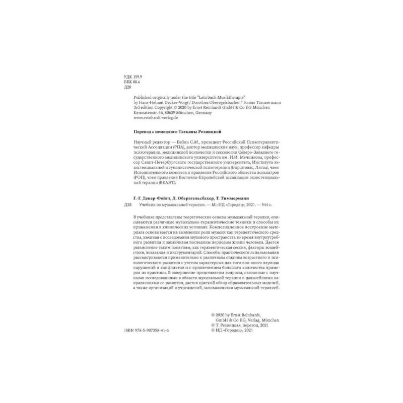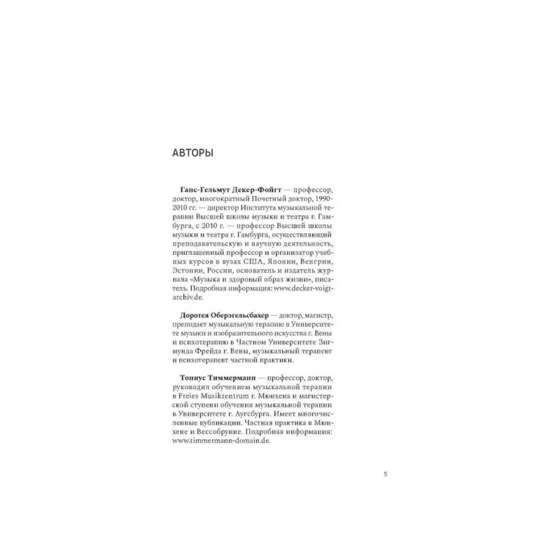 Учебник по музыкальной терапии. Ганс-Гельмут Декер-Фойгт, Доротея Оберэгельсбахер, Тониус Тиммерманн. В учебнике представлены теоретические основы музыкальной терапии, описываются различные музыкально-терапевтические техники и способы их применения в клинических условиях. Композиционное построение материала основывается на выявлении роли музыки как терапевтического средства, начиная с исследования звукового пространства во время внутриутробного развития и заканчивая последним периодом жизни человека. Дается разъяснение таким понятиям, как терапевтическая сессия, факторы воздействия, показания и инструментарий. Способы практического использования рассматриваются применительно к различным стадиям возрастного и психологического развития с учетом характерных для того или иного периода нарушений и конфликтов и с привлечением большого количества примеров из практики. В завершение представлены вопросы, связанные с научными исследованиями в области музыкальной терапии и дальнейшими направлениями ее развития, дается краткий обзор образовательных моделей, а также организаций и учреждений, занимающихся музыкальной терапией.