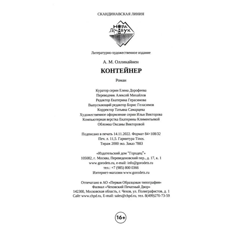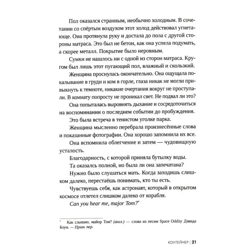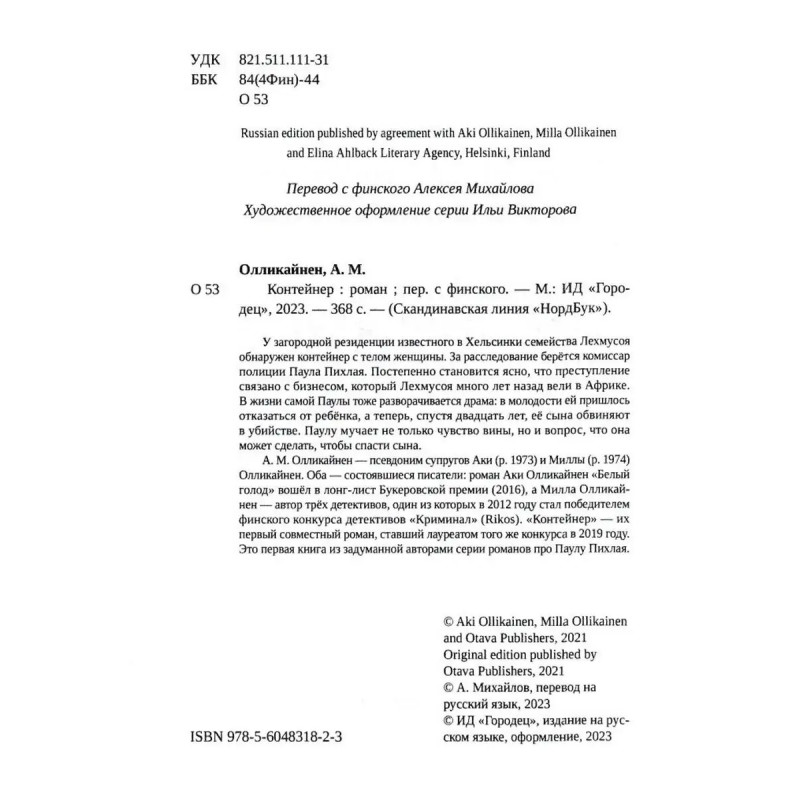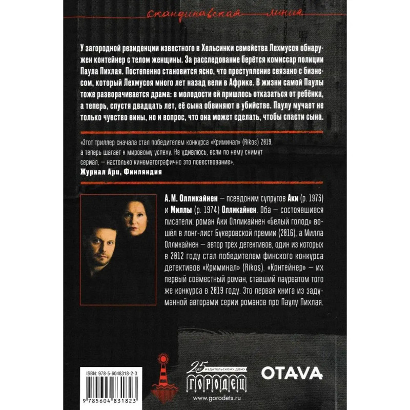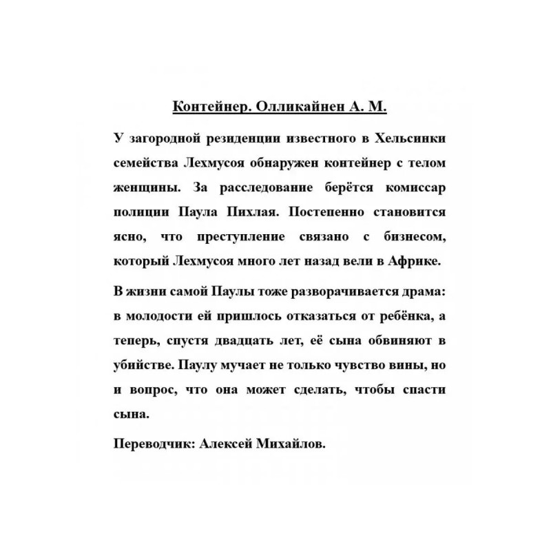 Контейнер. Олликайнен А. М. У загородной резиденции известного в Хельсинки семейства Лехмусоя обнаружен контейнер с телом женщины. За расследование берётся комиссар полиции Паула Пихлая. Постепенно становится ясно, что преступление связано с бизнесом, который Лехмусоя много лет назад вели в Африке.В жизни самой Паулы тоже разворачивается драма: в молодости ей пришлось отказаться от ребёнка, а теперь, спустя двадцать лет, её сына обвиняют в убийстве. Паулу мучает не только чувство вины, но и вопрос, что она может сделать, чтобы спасти сына.Переводчик: Алексей Михайлов.