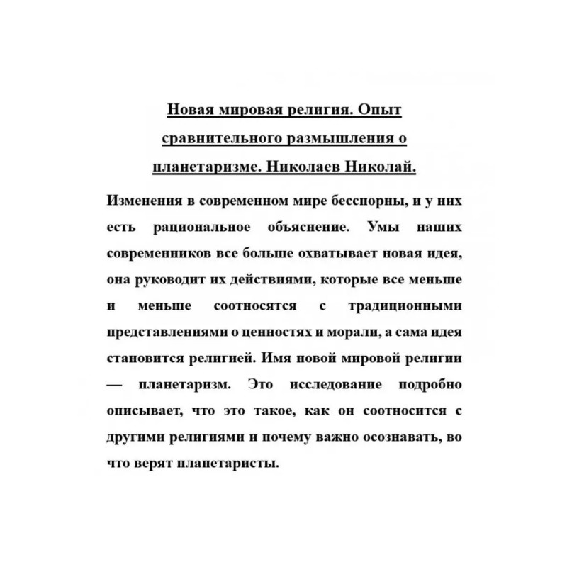 Новая мировая религия. Опыт сравнительного размышления о планетаризме. Николаев Николай. Изменения в современном мире бесспорны, и у них есть рациональное объяснение. Умы наших современников все больше охватывает новая идея, она руководит их действиями, которые все меньше и меньше соотносятся с традиционными представлениями о ценностях и морали, а сама идея становится религией. Имя новой мировой религии планетаризм. Это исследование подробно описывает, что это такое, как он соотносится с другими религиями и почему важно осознавать, во что верят планетаристы.