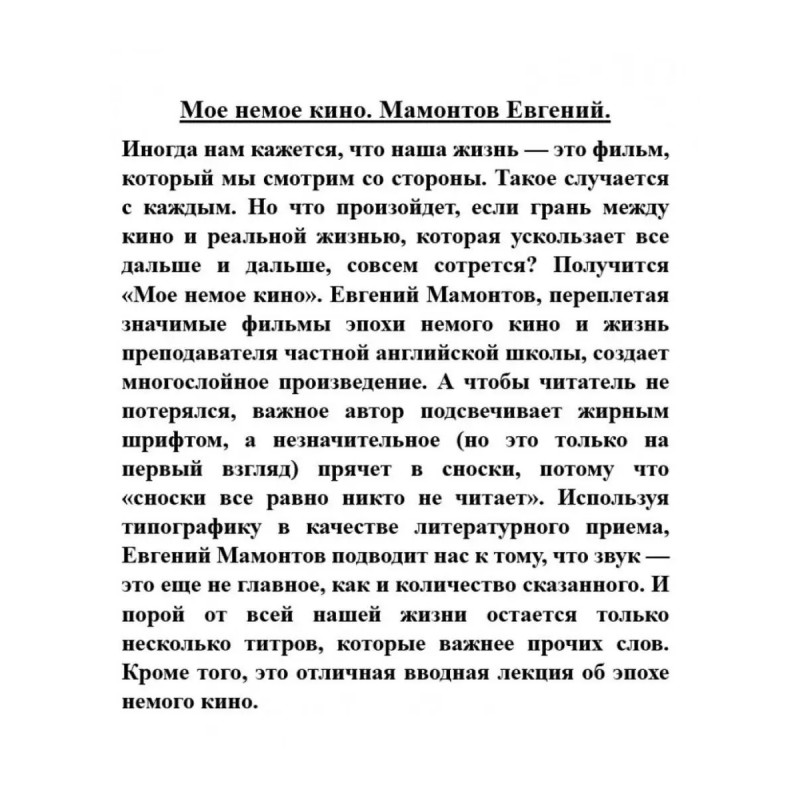 Мое немое кино. Мамонтов Евгений. Иногда нам кажется, что наша жизнь это фильм, который мы смотрим со стороны. Такое случается с каждым. Но что произойдет, если грань между кино и реальной жизнью, которая ускользает все дальше и дальше, совсем сотрется? Получится "Мое немое кино". Евгений Мамонтов, переплетая значимые фильмы эпохи немого кино и жизнь преподавателя частной английской школы, создает многослойное произведение. А чтобы читатель не потерялся, важное автор подсвечивает жирным шрифтом, а незначительное (но это только на первый взгляд) прячет в сноски, потому что "сноски все равно никто не читает". Используя типографику в качестве литературного приема, Евгений Мамонтов подводит нас к тому, что звук это еще не главное, как и количество сказанного. И порой от всей нашей жизни остается только несколько титров, которые важнее прочих слов. Кроме того, это отличная вводная лекция об эпохе немого кино.