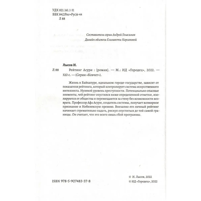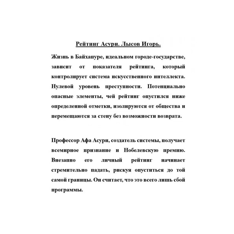 Рейтинг Асури. Лысов Игорь. Жизнь в Байхапуре, идеальном городе-государстве, зависит от показателя рейтинга, который контролирует система искусственного интеллекта. Нулевой уровень преступности. Потенциально опасные элементы, чей рейтинг опустился ниже определенной отметки, изолируются от общества и перемещаются за стену без возможности возврата.Профессор Афа Асури, создатель системы, получает всемирное признание и Нобелевскую премию. Внезапно его личный рейтинг начинает стремительно падать, рискуя опуститься до той самой границы. Он считает, что это всего лишь сбой программы.