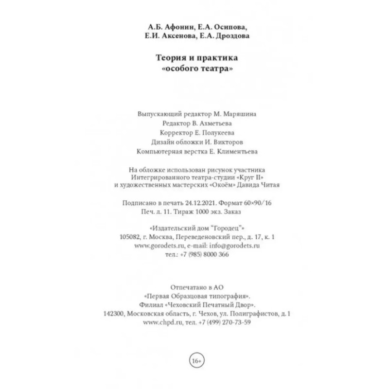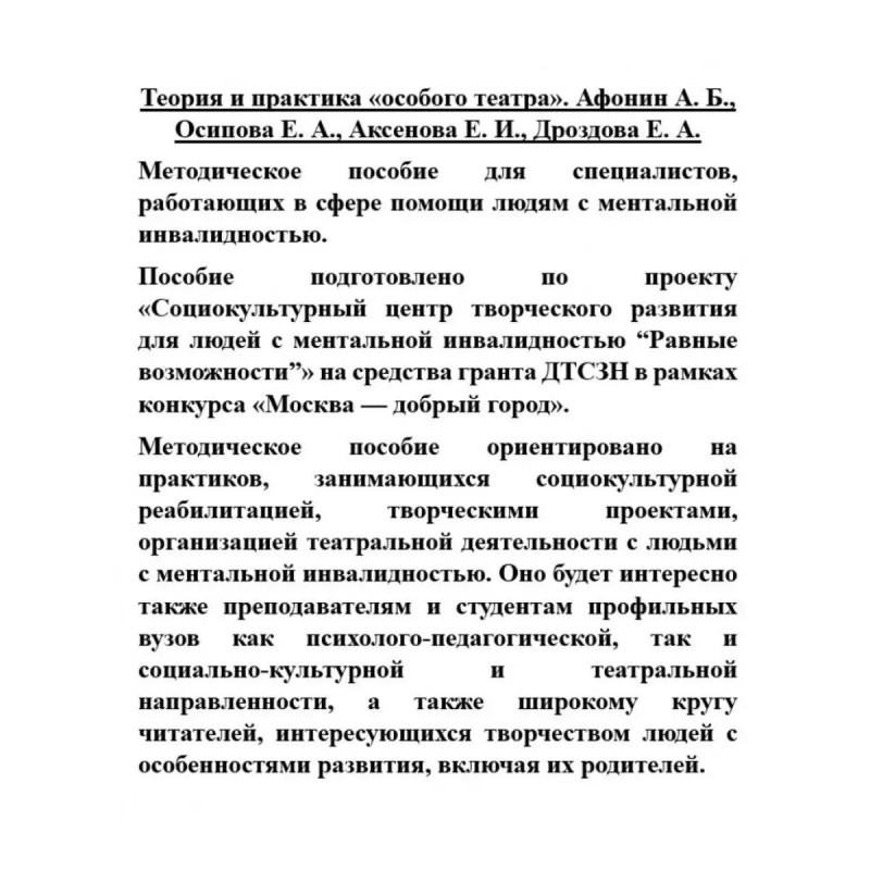 Теория и практика "особого театра". Афонин А.Б., Осипова Е.А., Аксенова Е.И., Дроздова Е.А. Методическое пособие для специалистов, работающих в сфере помощи людям с ментальной инвалидностью.Пособие подготовлено по проекту "Социокультурный центр творческого развития для людей с ментальной инвалидностью Равные возможности" на средства гранта ДТСЗН в рамках конкурса "Москва добрый город".Методическое пособие ориентировано на практиков, занимающихся социокультурной реабилитацией, творческими проектами, организацией театральной деятельности с людьми с ментальной инвалидностью. Оно будет интересно также преподавателям и студентам профильных вузов как психолого-педагогической, так и социально-культурной и театральной направленности, а также широкому кругу читателей, интересующихся творчеством людей с особенностями развития, включая их родителей.
