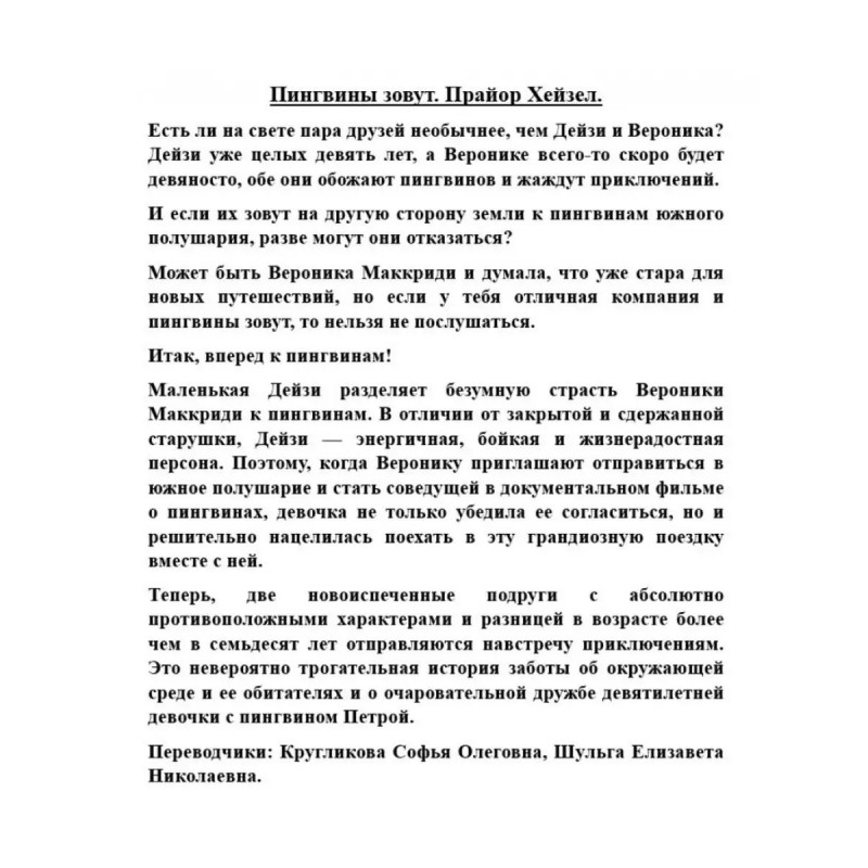Пингвины зовут. Прайор Хейзел. Есть ли на свете пара друзей необычнее, чем Дейзи и Вероника? Дейзи уже целых девять лет, а Веронике всего-то скоро будет девяносто, обе они обожают пингвинов и жаждут приключений. И если их зовут на другую сторону земли к пингвинам южного полушария, разве могут они отказаться?Может быть Вероника Маккриди и думала, что уже стара для новых путешествий, но если у тебя отличная компания и пингвины зовут, то нельзя не послушаться. Итак, вперед к пингвинам!Маленькая Дейзи разделяет безумную страсть Вероники Маккриди к пингвинам. В отличии от закрытой и сдержанной старушки, Дейзи энергичная, бойкая и жизнерадостная персона. Поэтому, когда Веронику приглашают отправиться в южное полушарие и стать соведущей в документальном фильме о пингвинах, девочка не только убедила ее согласиться, но и решительно нацелилась поехать в эту грандиозную поездку вместе с ней. Теперь, две новоиспеченные подруги с абсолютно противоположными характерами и разницей в возрасте более чем в семьдесят лет отправляются навстречу приключениям. Это невероятно трогательная история заботы об окружающей среде и ее обитателях и о очаровательной дружбе девятилетней девочки с пингвином Петрой. Переводчики: Кругликова Софья Олеговна, Шульга Елизавета Николаевна.