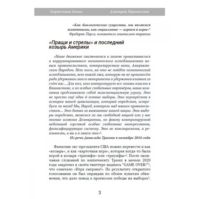 Карточный домик. Перетолчин Д.Ю. Зачастую за протокольными политическими событиями скрывается азартная игра, которую ведут правительства, их спецслужбы и армии. Но кто тасует политическую колоду и сдаёт карты игрокам? Кого имеет в виду Дональд Трамп, заявляя: "Они пришли не за мной, они пришли за Вами!". Кто эти "они" и каковы реальные ставки в мировой игре? На смену глобального гегемона, роль которого последние сто лет играли США приходит явление, которое все чаще называют "глубинным государством". Ему нельзя дать имя, оно столь многолико, что пронизывает собой почти все политические и социальные сферы. О нём не пишут в новостях и не снимают кинофильмов, потому что оно контролирует и новости, и кино. Данная книга посвящена скрытым механизмам мировой политики на примере последних событий на Украине и в США, которые неразрывно связаны с мировой глобальной повесткой.