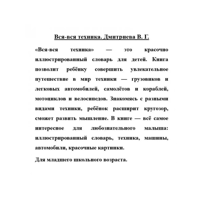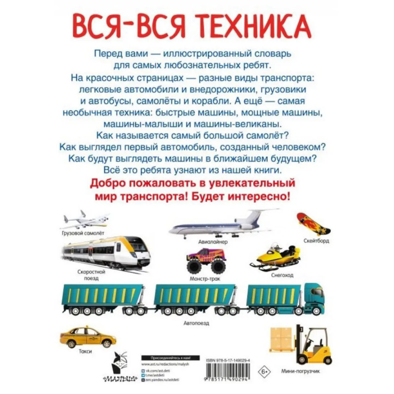 Вся-вся техника. Дмитриева В. Г. "Вся-вся техника" это красочно иллюстрированный словарь для детей. Книга позволит ребёнку совершить увлекательное путешествие в мир техники грузовиков и легковых автомобилей, самолётов и кораблей, мотоциклов и велосипедов. Знакомясь с разными видами техники, ребёнок расширит кругозор, сможет развить мышление. В книге всё самое интересное для любознательного малыша: иллюстрированный словарь, техника, машины, автомобили, красочные картинки. Для младшего школьного возраста.
