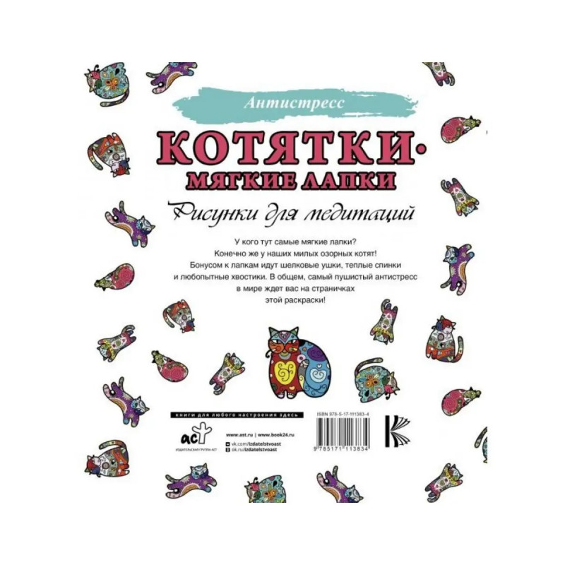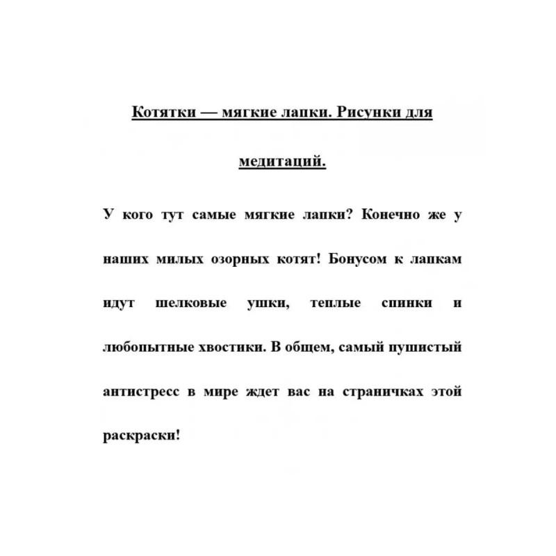 Котятки - мягкие лапки. Рисунки для медитаций. У кого тут самые мягкие лапки? Конечно же у наших милых озорных котят! Бонусом к лапкам идут шелковые ушки, теплые спинки и любопытные хвостики. В общем, самый пушистый антистресс в мире ждет вас на страничках этой раскраски!